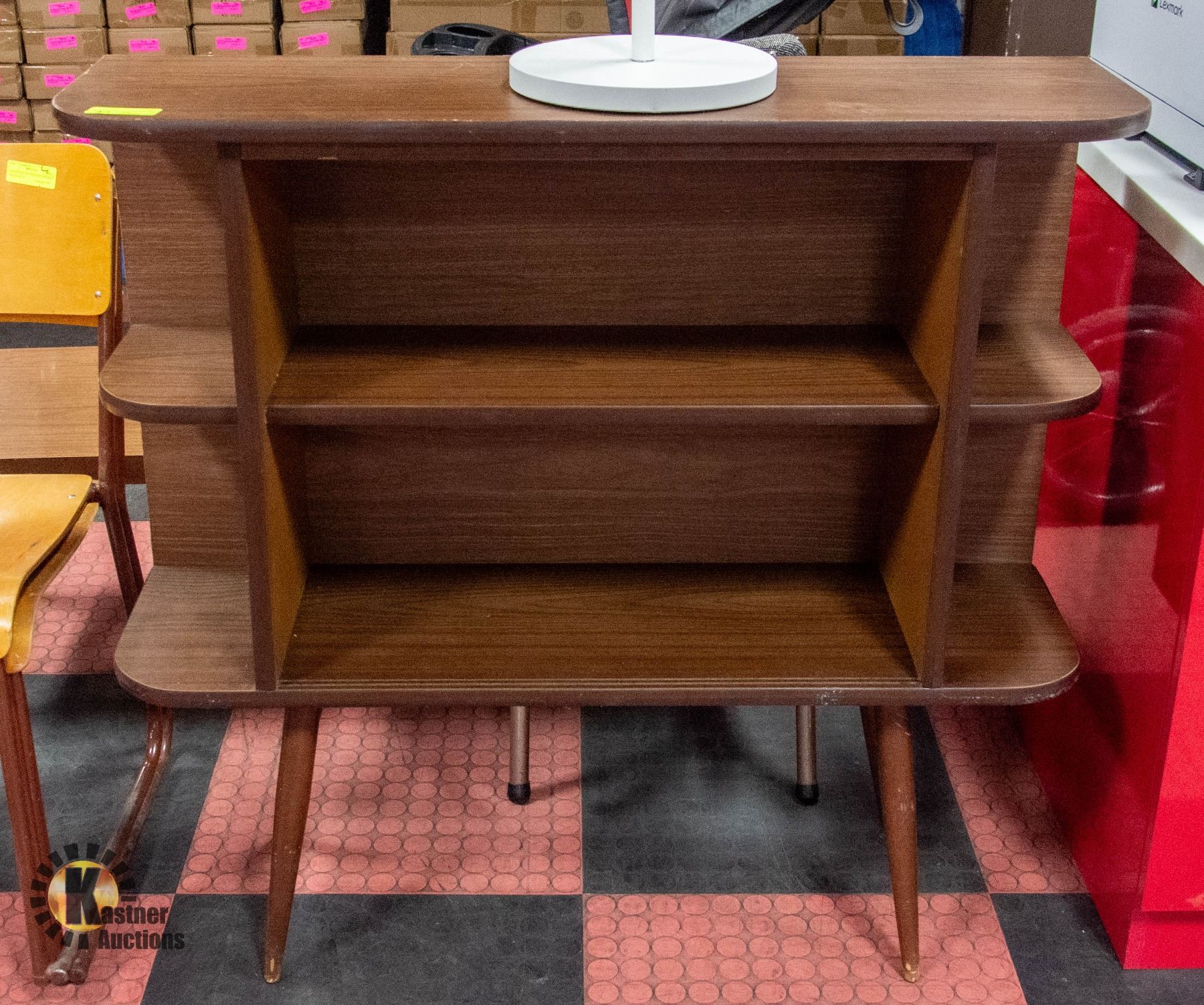 STORAGE CABINET - 3 MAIN SHELF WITH 4 CUBBY DISPLAY SHELVES, DARK WOODGRAIN WITH WOOD LEGS (41"L X 12"W X 39"H) **ALL ITEMS MUST BE REMOVED BY 5PM SATURDAY, JULY 29TH 2023. ALL REMAINING ITEMS WILL BE SUBJECT TO A $6.00 PER DAY STORAGE CHARGE. ANY ITEMS REMAINING AFTER MONDAY, AUGUST 14TH, 2023 WILL BE CONSIDERED FORFEITED. NO REFUNDS WILL BE ISSUED FOR FORFEITED ITEMS. TO SCHEDULE A PICK UP APPOINTMENT CLICK HERE