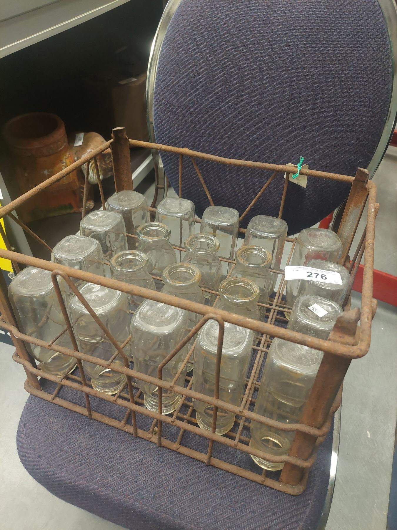 VINTAGE MILK BOTTLE BASKET W/BOTTLES