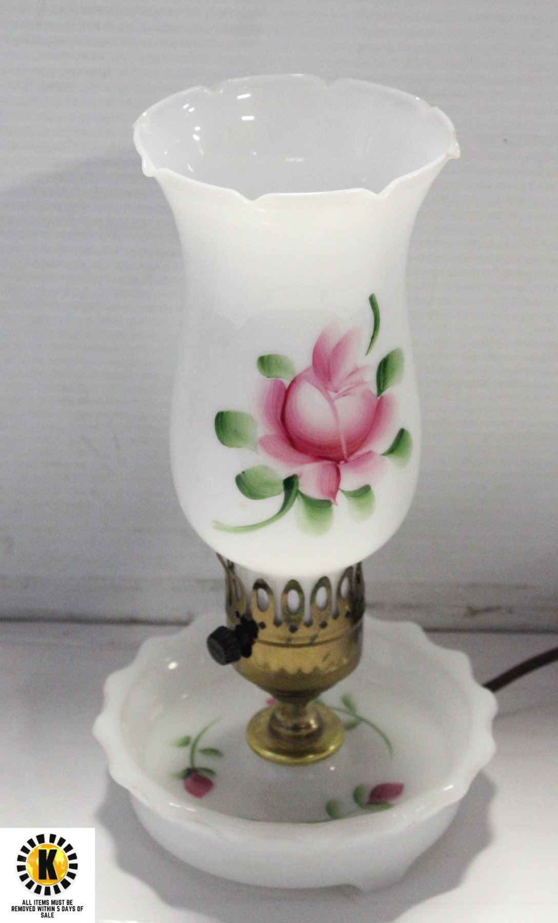 VINTAGE MILK GLASS FLORAL ELECTRIC HURRICANE LAMP