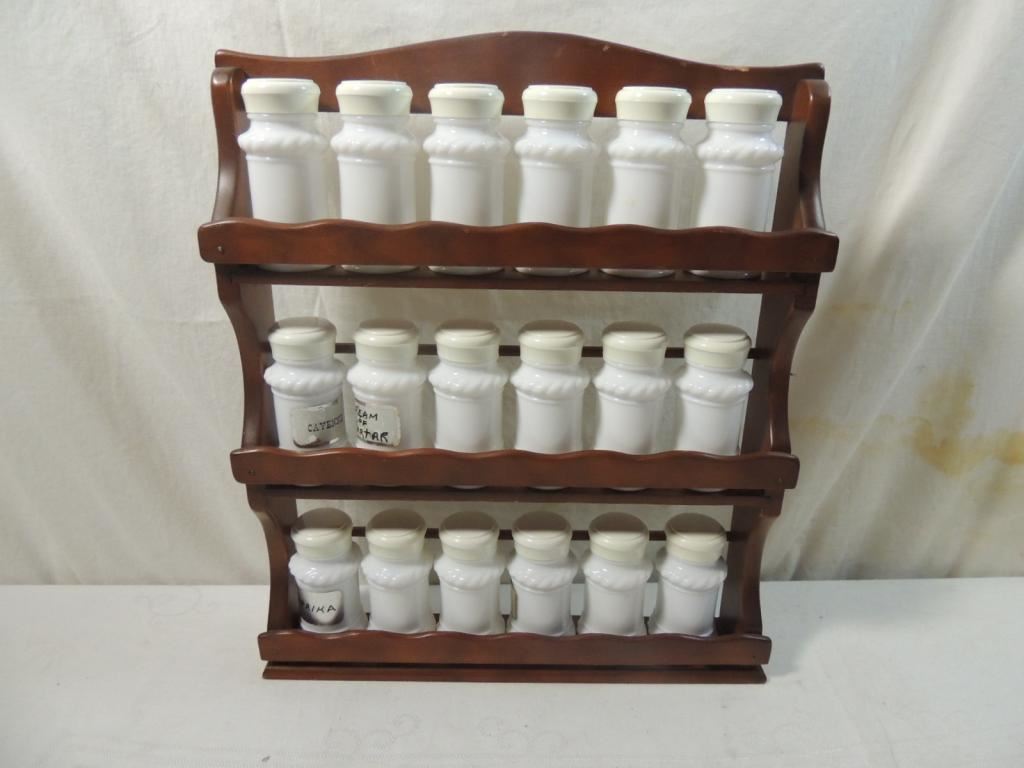 VINTAGE SPICE RACK, MILK GLASS JARS, VINTAGE JARS AND WALL RACK AS SHOWN SEE PHOTO FOR MORE DETAILS.
