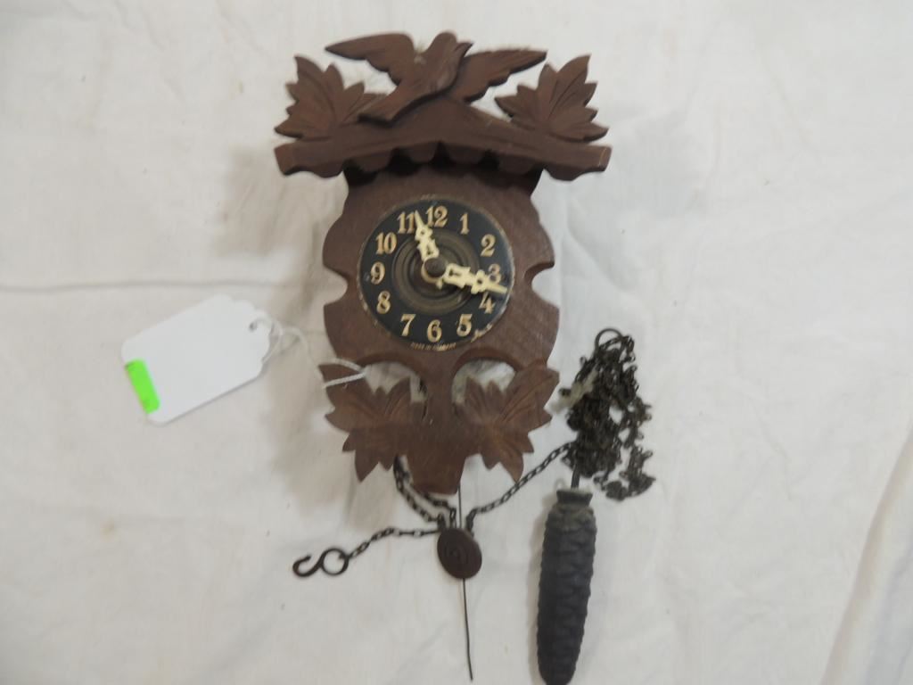 WOODEN GERMAN BLACK FOREST CLOCK, DECORATIV CLOCK, WEIGHT PENDULIM BIRD AND LEAVE DETAILS AS SHOWN SEE PHOTO FOR MORE DETAILS.