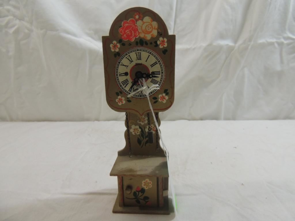 VINTAGE GERMAN MINIATURE HECO WIND UP GRANDFATHER WALL CLOCK, COLLECTIBLE CLOCK, VINTAGE CLOCK, DETAILED GERMAN WOODEN CLOCK, AS SHOWN SEE PHOTO FOR MORE DETAILS.