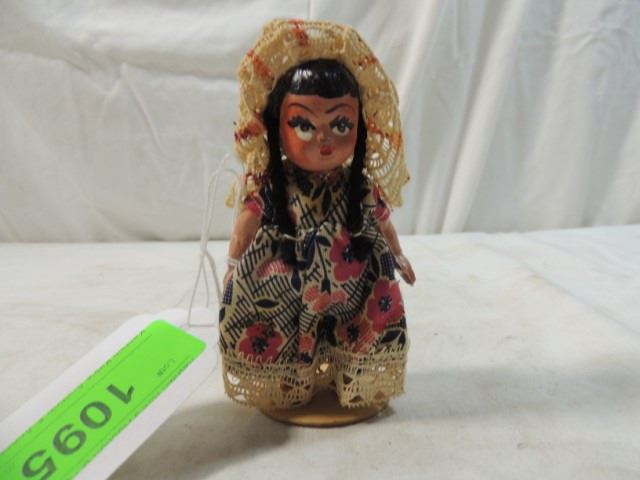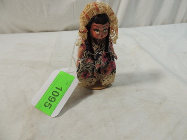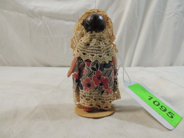 SMALL ANTIQUE VINTAGE DOLL STANDS JUST 4.5" TALL, HAND PAINTED, ETC. AS SHOWN, ON STAND.