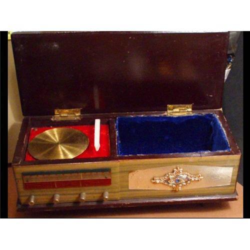 </font></strong>IF you are a collector of old vinyl records or old stereos then this is the PERFECT addition to your collection! It is a miniature working music box with a brass record and a record player arm that actually moves. This is faux knobs and even a stereo insignia to represent the speaker on the front . This measures 9" long x 4" deep and 3 1/2" tall. IT even has the little legs on it and inside a place to store things. JUST ADORABLE!When you wind it up it plays ( not sure of the tune)</font>