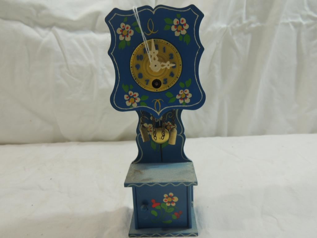 VINTAGE GERMAN MINIATURE HECO WIND UP GRANDFATHER WALL CLOCK, COLLECTIBLE CLOCK, VINTAGE CLOCK, DETAILED GERMAN WOODEN CLOCK, AS SHOWN SEE PHOTO FOR MORE DETAILS.