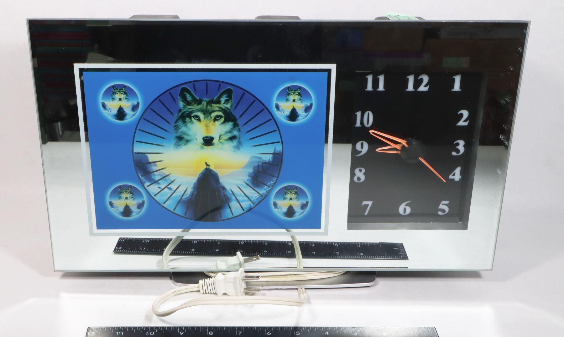 VINTAGE MIRRORED WOLF THEME CLOCK, WALL PLUG