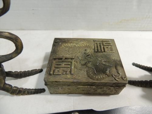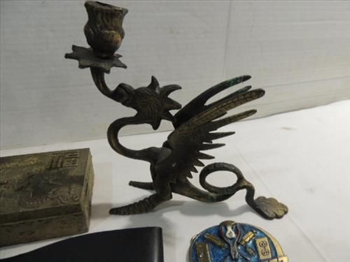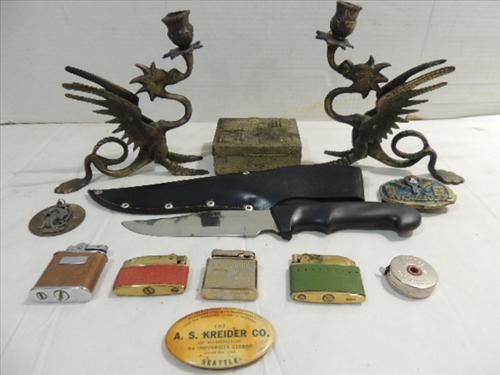 VINTAGE MIX SELECTION: 4 CIGARETTE LIGHTERS, KNIFE, PAIR BRASS DRAGON CANDLE HOLDERS, ORIENTAL JEWELRY BOX, BELT BUCKLES. A SHOWN. VIEW PICTURE FOR DETAIL.