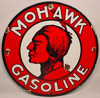 VINTAGE MOHAWK GASOLINE PORCELAIN ADVERTISING SIGN - Has some chips and dings. Approx. 11.75" diameter
