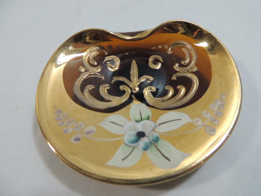 VINTAGE MURANO VENETAIN ART GLASS HAND PAINTED DISH. 24KT GOLD PAINT. DECORATIVE. AMBER GLASS. AS SHOWN SEE PHOTO FOR MORE DETAILS.