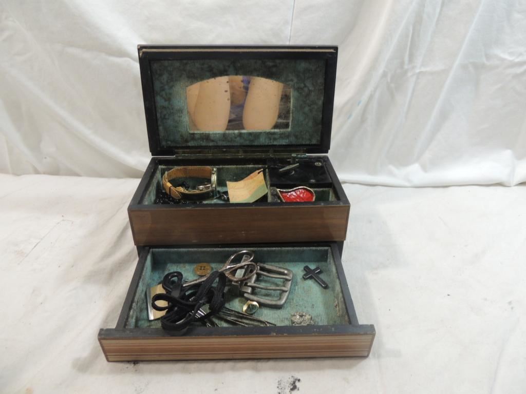 VINTAGE MUSIC JEWELRY BOX WITH ASSORTED JEWELRY, VINTAGE JEWELRY, RINGS, NECKLACE, PIN, WATCH, HAIR PINS, COLLECTIBLE, FASHION JEWELRY AS SHOWN SEE PHOTO FOR MORE DETAILS.