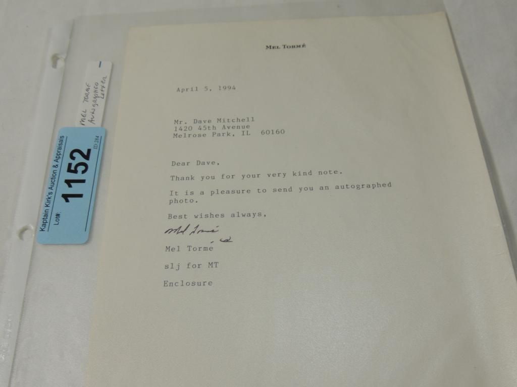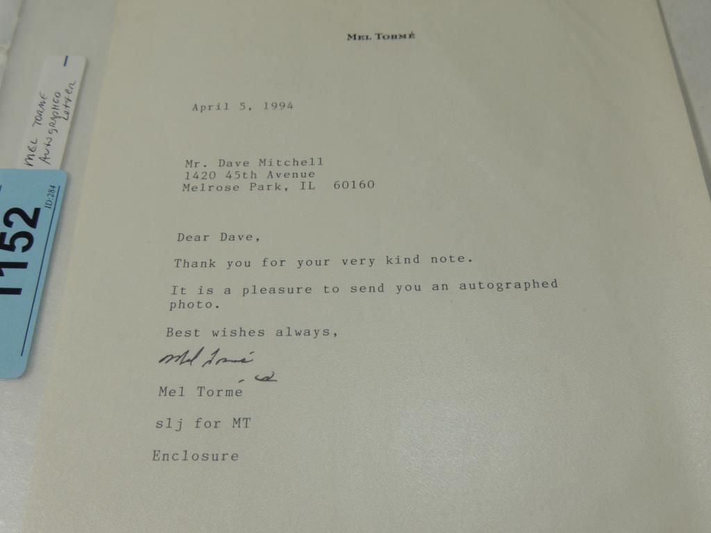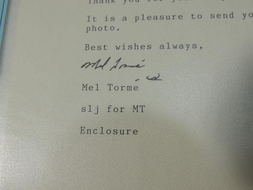 VINTAGE MUSICAL ARTIST MEL TORME SIGNED LETTER. LETTER ACKNOWLEDGING MEL SENDING AN AUTOGRAPHED PHOTO. NO COA. AS SHOWN. VIEW PICTURE FOR DETAIL.