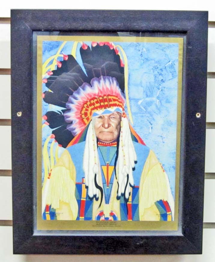 Mountain Chief Blackfeet Brave Glacier National Park. From original portrait by W. Langdon Khn New York. Copyrighted Great Northern RY. St. Paul, U.S.A. The frame has Two (2) small drill holes on the front.