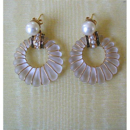 A PAIR OF VINTAGE 14K YELLOW GOLD/ 8 NATURAL PEARLS/ ENAMEL/ FROSTED ROCK CRYSTAL AND 2 CULTURED PEARLS 8.3MM EARRINGS. The rock crystal hoops have 14k wires in the grooves/ STAMPED: 14K / These stunning earrings are for pierced ears / 1 1/4"+ hoops suspend from the cultured pearls. BURTON BROOK FARM ANTIQUES