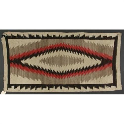 WEAVING: Navajo eyedazzler weaving (weft is of native-spun natural and aniline-dyed wool) having central serrated diamond motif with central red/orange layer of diamonds and deep brown border. Note stains and unraveling. Second quarter 20th c. 69'' x 36''
