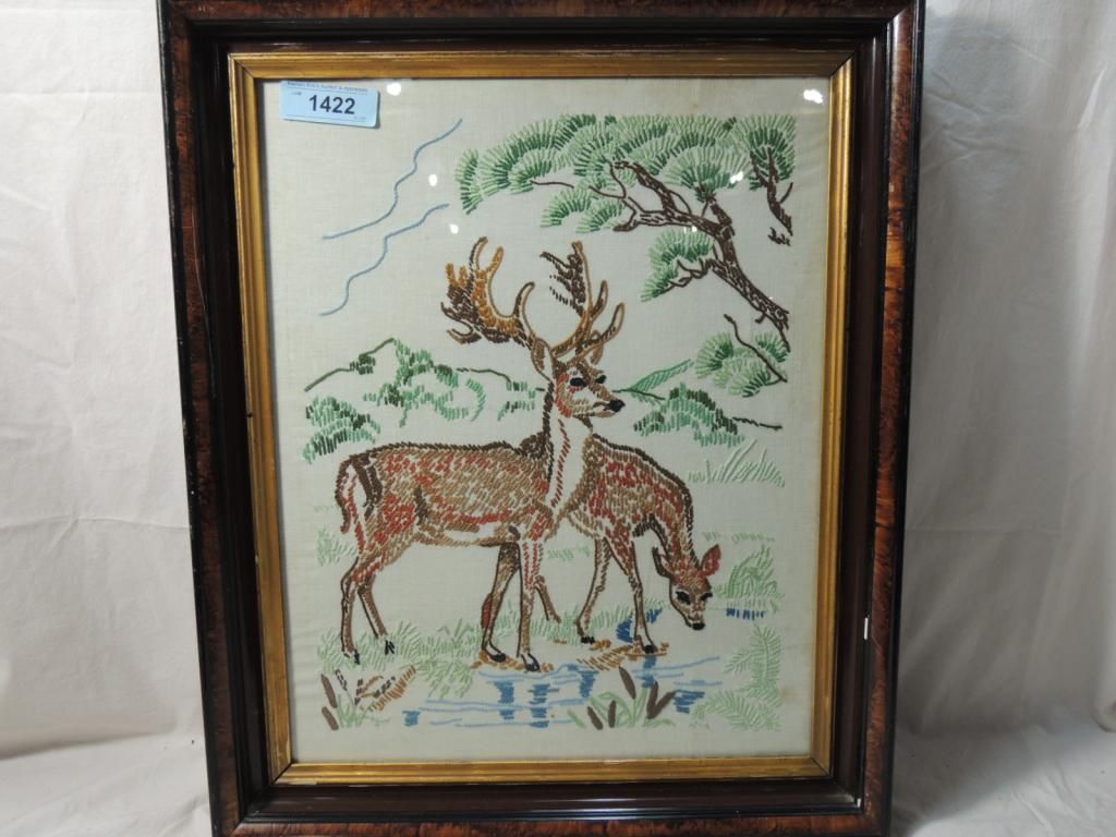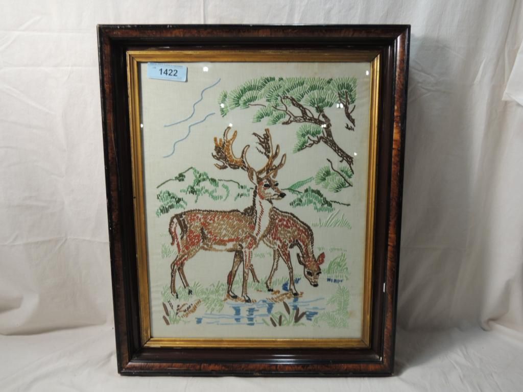 VINTAGE NEEDLEPOINT DEER SCENE. DEER BY STREAM. TREES. AS SHOWN. SEE PHOTO FOR MORE DETAILS. 19 X 24. NICE FRAME.