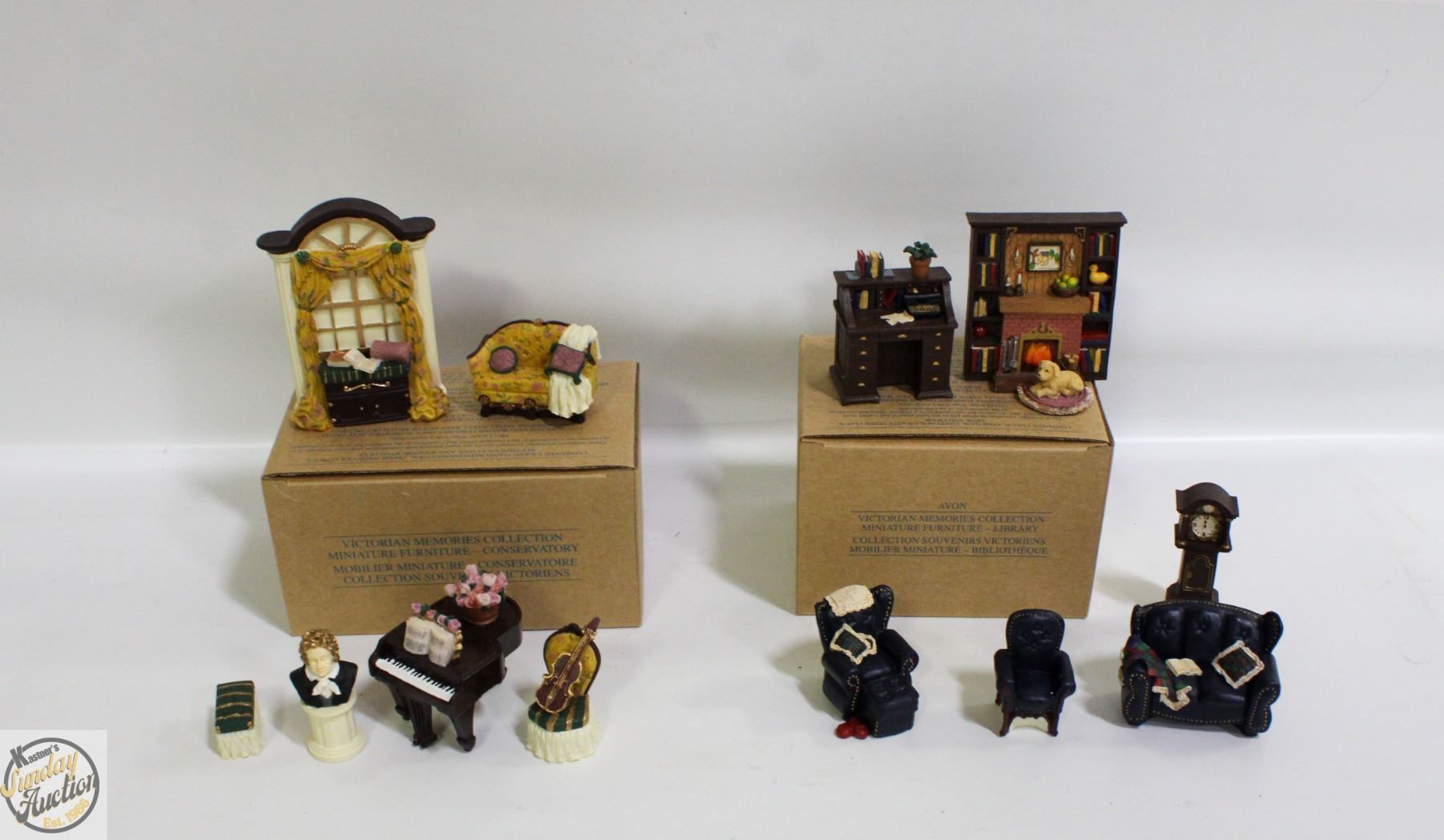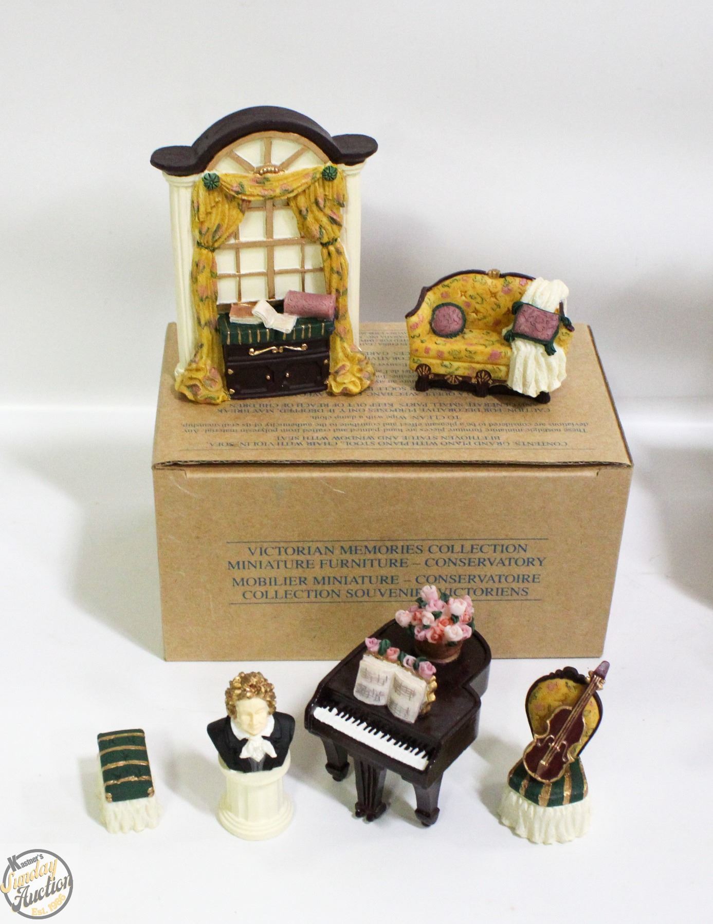 MEMORIES MINIATURE DOLL HOUSE FURNITURE HAND PAINTED COUCH, ARMCHAIR, FIREPLACE, GRANDFATHER CLOCK, DESK, CHAIR, GRAND PIANO WITH STOOL, CHAIR WITH VIOLIN, SOFA, BEETHOVEN STATUE AND WINDOW WITH SEAT **ALL ITEMS MUST BE REMOVED BY 5PM SATURDAY, NOVEMBER 1ST 2025. ALL REMAINING ITEMS WILL BE SUBJECT TO A $6.00 PER DAY STORAGE CHARGE. ANY ITEMS REMAINING AFTER MONDAY, NOVEMBER 17TH 2025 WILL BE CONSIDERED FORFEITED. NO REFUNDS WILL BE ISSUED FOR FORFEITED ITEMS. TO SCHEDULE A PICK UP APPOINTMENT CLICK HERE