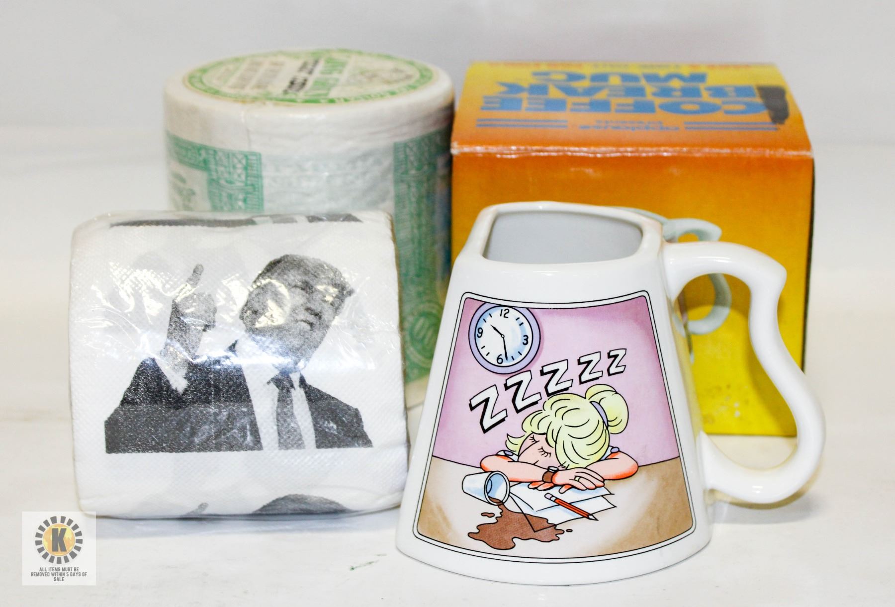 COFFEE BREAK MUG NOVELTY W/SEALED 2 NOVELTY TOILET PAPER "BIG GREEN MONEY" & DONALD TRUMP **ALL ITEMS MUST BE REMOVED BY 5PM SATURDAY, MARCH 22ND 2025. ALL REMAINING ITEMS WILL BE SUBJECT TO A $6.00 PER DAY STORAGE CHARGE. ANY ITEMS REMAINING AFTER MONDAY, APRIL 7TH 2025 WILL BE CONSIDERED FORFEITED. NO REFUNDS WILL BE ISSUED FOR FORFEITED ITEMS. TO SCHEDULE A PICK UP APPOINTMENT CLICK HERE
