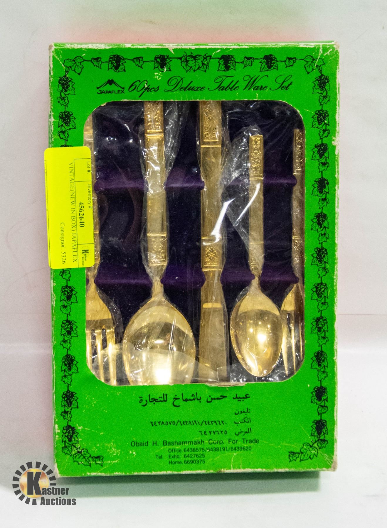 60 PC SET STAINLESS STEEL DELUXE TABLE WARE GOLD COLOR **ALL ITEMS MUST BE REMOVED BY 5PM SATURDAY, OCTOBER 5TH 2024. ALL REMAINING ITEMS WILL BE SUBJECT TO A $6.00 PER DAY STORAGE CHARGE. ANY ITEMS REMAINING AFTER MONDAY, OCTOBER 21ST 2024 WILL BE CONSIDERED FORFEITED. NO REFUNDS WILL BE ISSUED FOR FORFEITED ITEMS. TO SCHEDULE A PICK UP APPOINTMENT CLICK HERE