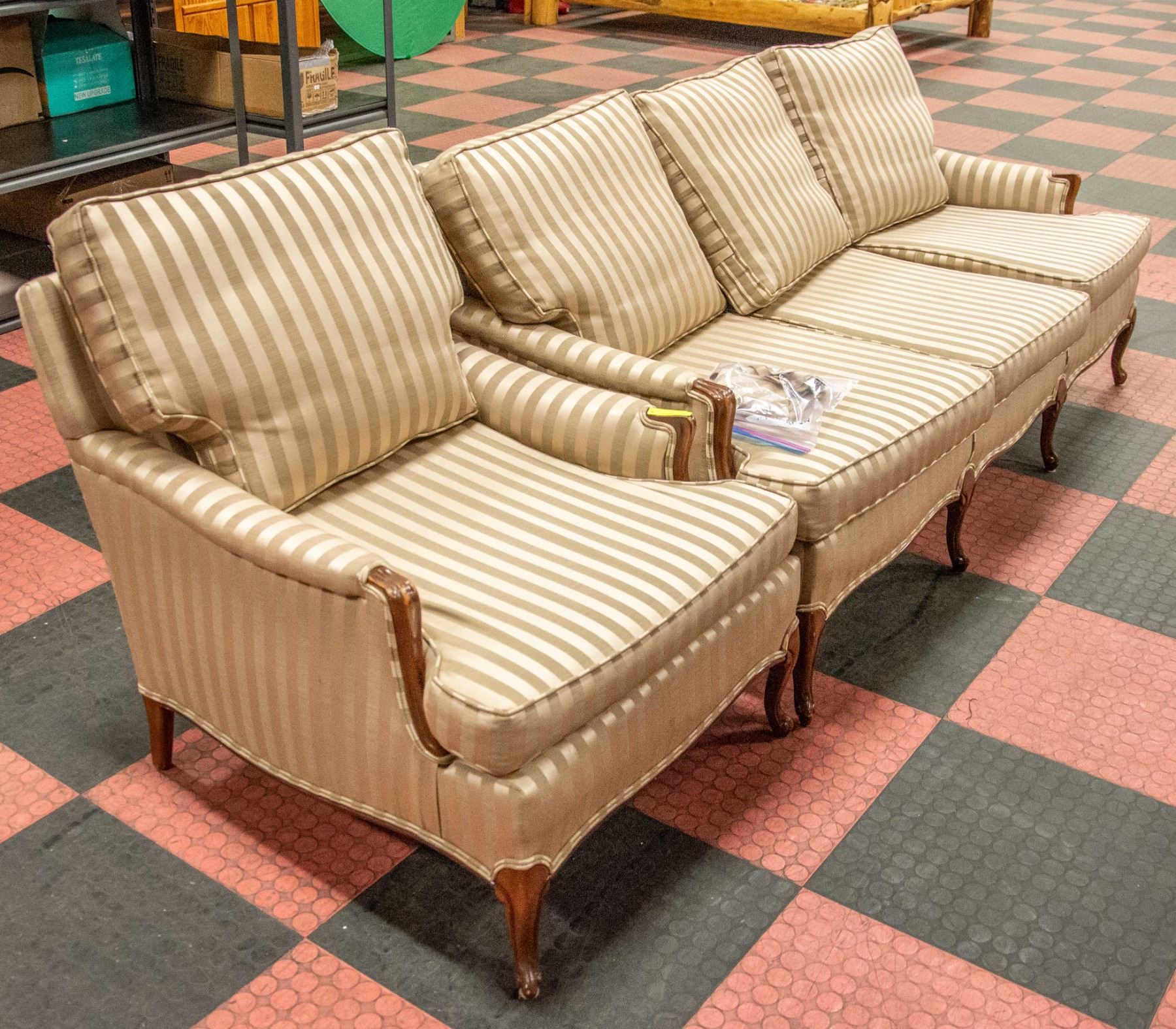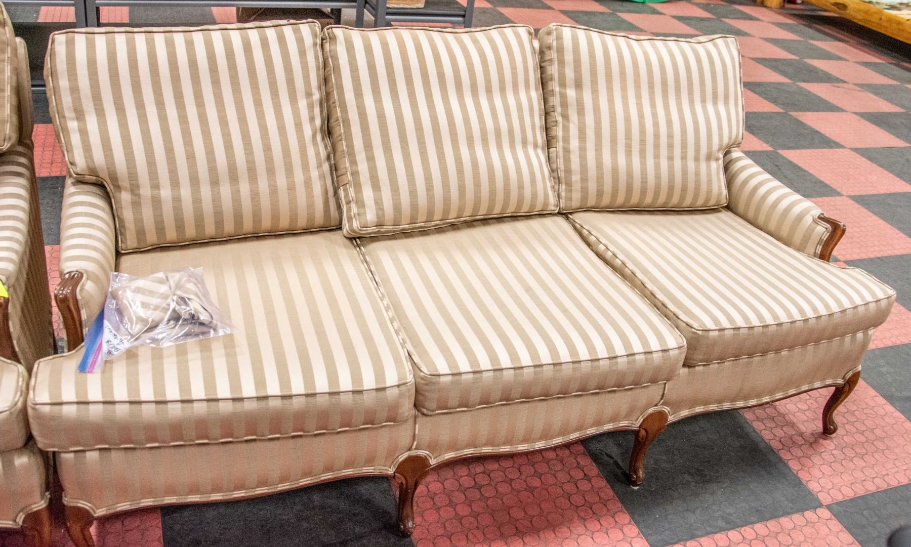 GOLD STRIPING AND TONES COUCH AND MATCHING CHAIR **ALL ITEMS MUST BE REMOVED BY 5PM FRIDAY, SEPTEMBER 2ND, 2022. ALL REMAINING ITEMS WILL BE SUBJECT TO A $6.00 PER DAY STORAGE CHARGE. ANY ITEMS REMAINING AFTER FRIDAY, SEPTEMBER 2, 2022 WILL BE CONSIDERED FORFEITED. NO REFUNDS WILL BE ISSUED FOR FORFEITED ITEMS.** TO SCHEDULE A PICK UP APPOINTMENT. CLICK HERE