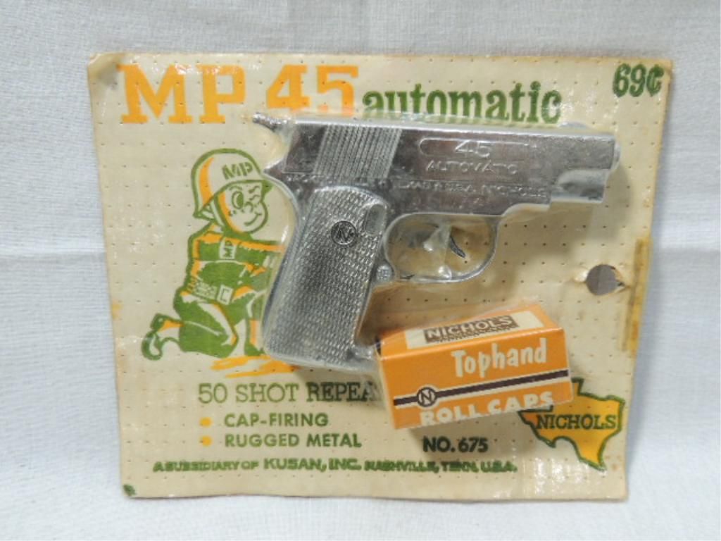VINTAGE NICHOLS MP 45 AUTOMATIC CAP PISTOL & CAPS. NEW ON ORIGINAL BLISTER PACK BOARD. AS SHOWN. VIEW PICTURE FOR DETAIL.