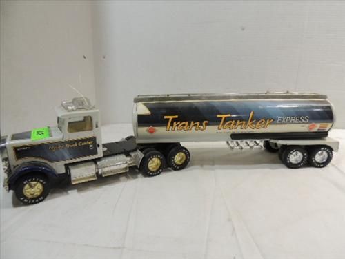 VINTAGE NYLINT PRESS METAL CAB & TANKER TRAILER. 25"L. AS SHOWN. VIEW PICTURE FOR DETAIL.