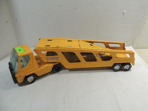 VINTAGE NYLINT PRESS METAL SEMI CAB & CAR TRAILER. 28"L. AS SHOWN. VIEW PICTURE FOR DETAIL.