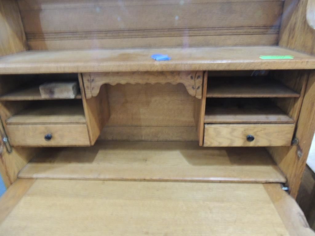 FOLD DOWN DESK, WOODEN OAK? VINTAGE BOOKCASE, DECORATIVE AS SHOWN SEE PHOTO FOR MORE DETAILS.