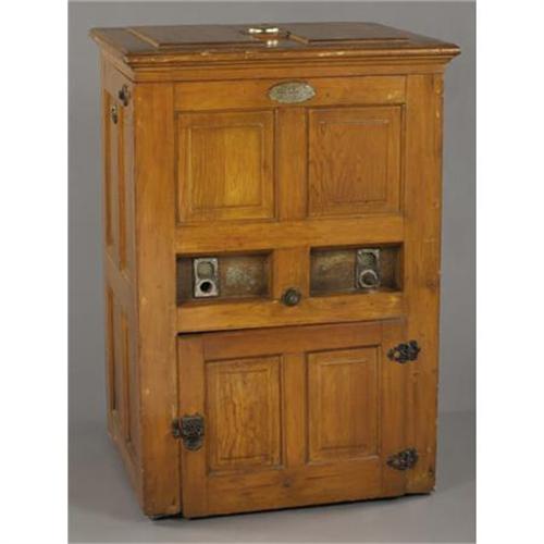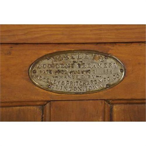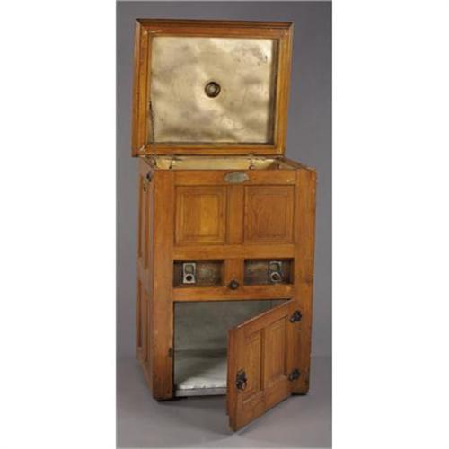 <B>VINTAGE OAK ICE BOX. Circa 1900-1920</B></I> - Nice original Oak ice box. Comes with all its original hardware, cast iron hinges, handles, Etc. except vent at top (replacement). Manufactured by Moseley & Company, Occident Creamery, Clinton, Iowa. Inside of box has been repainted. 2 drain plugs middle of box, 1 missing plug. 28”x 24”x 43”.<BR><BR><B>Condition:</B></I> The overall condition is very fine, oak has nice patina.<BR><BR><b>Shipping:</b> Requires 3rd Party Shipping (<a target="_blank" href="http://www.heritageauctions.com/common/shipping.php">view shipping information</a>)