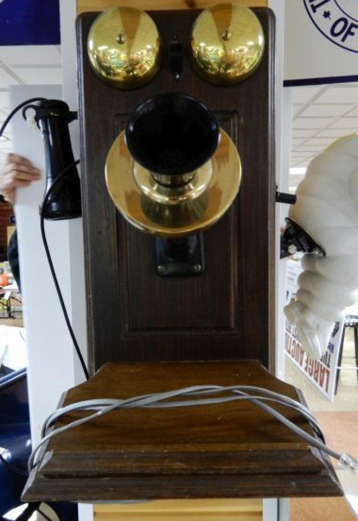 VINTAGE OAK WALL PHONE CONVERTED TO DIAL PHONE WORKING - BRASS BELLS & MOUTHPIECE LOCATION: LOWER LEFT