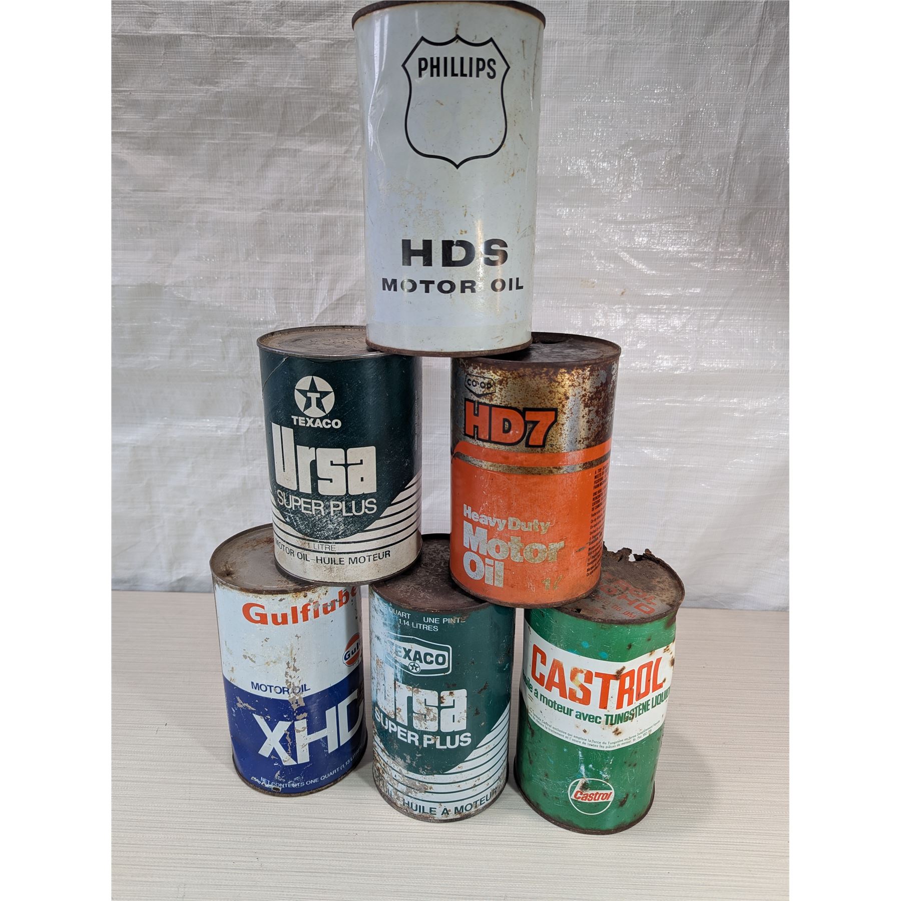 SIX VINTAGE OIL CANS. Five metal, one cardboard.