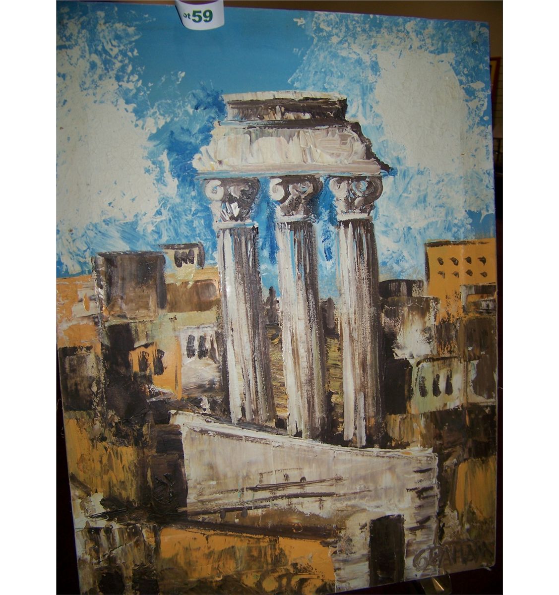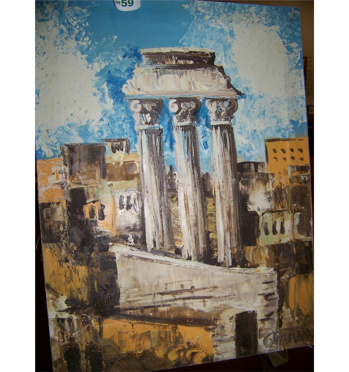 VINTAGE OIL ON CANVAS PAINTING  GRECIAN RUINS   FRAMED OVER STRETCHER BARS