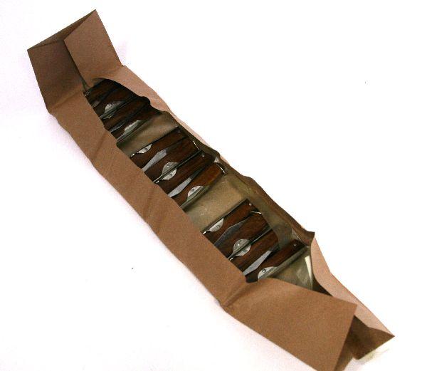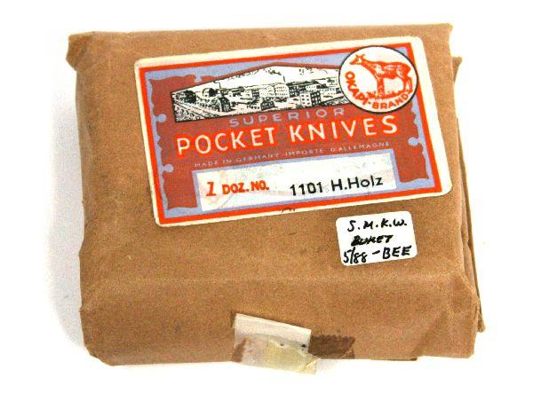 Original dealer package containing one dozen vintage Okapi brand folding pocket knives. Manufactured in Germany. As new condition. Package marked "1101 H. Holtz".