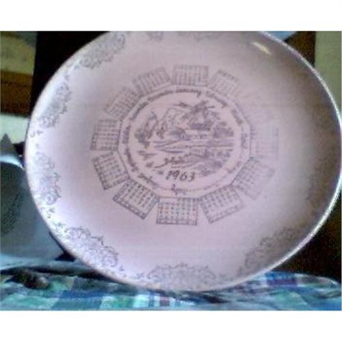 I PURCHASED THIS FROM AN ESTATE SALE. IF YOU REMEMBER 1963 OR OH WHAT A NIGHT...LATE DECEMBER BACK IN 1963...YOU HAVE GOT TO GET THIS PLATE. THIS IS A TAYLOR SMITH TAYLOR PEBBLEFORD 1963 CALENDAR PLATE. PINK SPECKLED WINDMILL SAIL BOAT. SOME OF THE GOLD FLORIAL PRINT IS FADING AND THE CALENDARS ON THE PLATE. THIS PLATE DEPICTS ALL 12 MONTHS OF 1963 (A FEW OF THE MONTHS ARE FADING) STILL VERY READABLE AND STILL A WONDERFUL NOSTALGIC AND COLLECTIBLE PIECE.