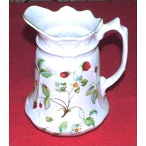 This is a vintage pitcher with a beautiful spray of strawberries, leaves and flowers on the front and back. It is marked Old Foley James Kent Ltd. Made in England, "Strawberry". It is about 7" tall and about 6" wide including the handle. It is in excellent condition with only a little bit of crazing at the bottom.