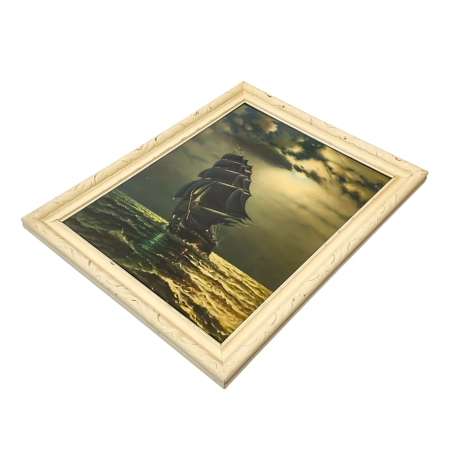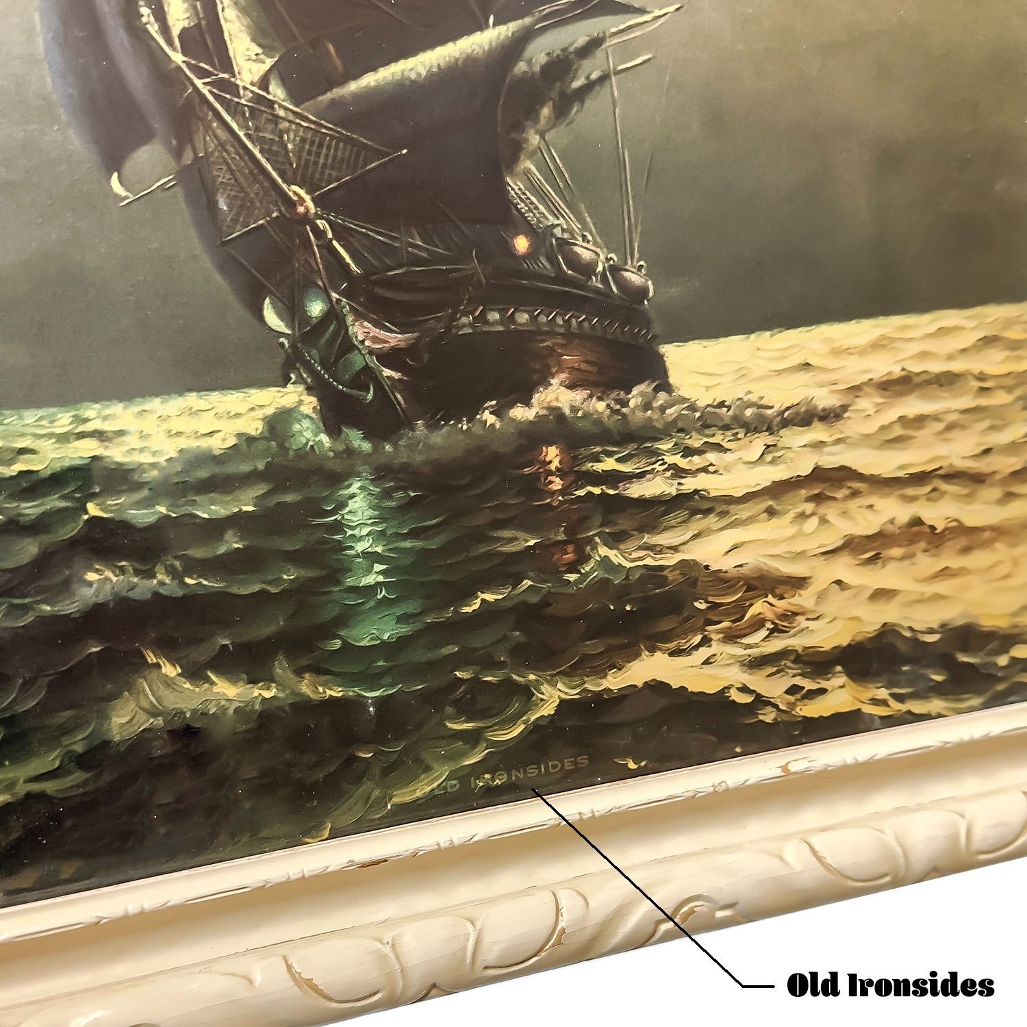 #8106 - VINTAGE PRINT OF THE SHIP USS CONSTITUTION, FAMOUSLY KNOWN AS “OLD IRONSIDES”. VINTAGE WOOD FRAME AND UNDER GLASS. COLLECTIBLE HOME OR OFFICE WALL DECOR PICTURE.