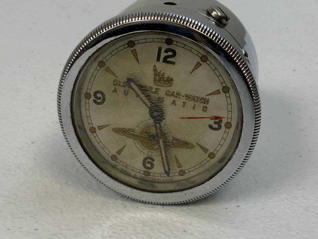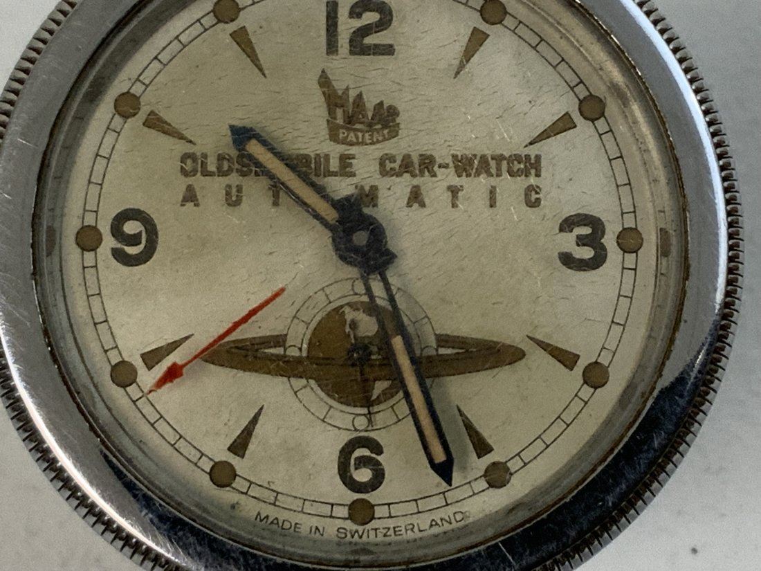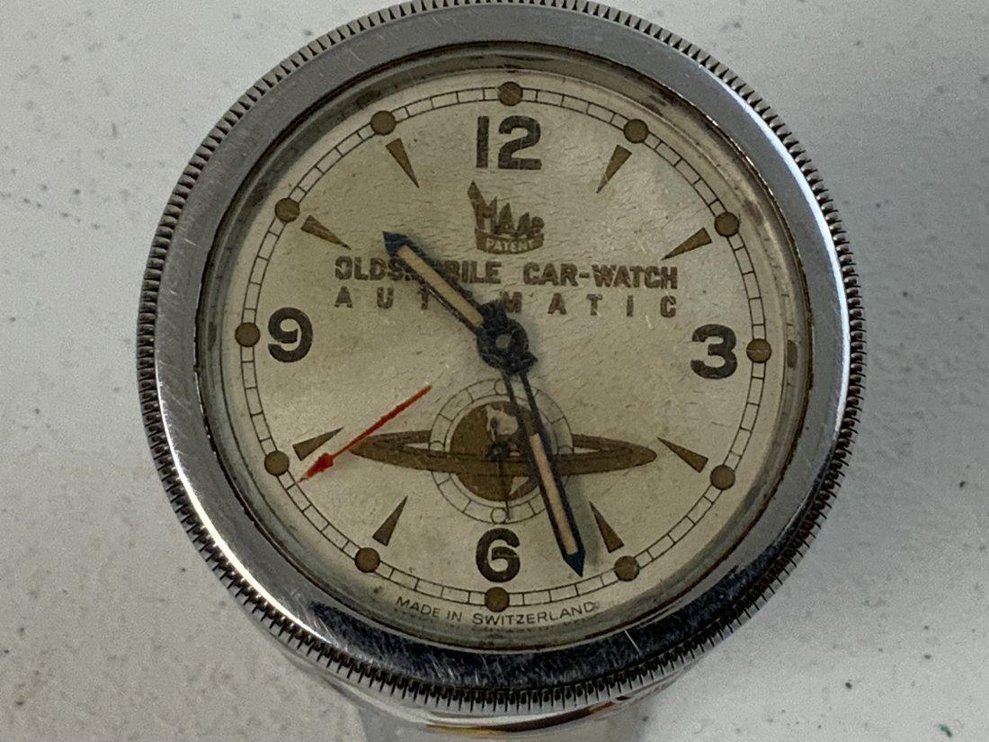 VINTAGE OLDSMOBILE MAAR SWISS AUTOMATIC CAR WATCH CLOCK. APPEARS TO BE IN GREAT CONDITION WITH JUST SOME CRAZING TO THE FRONT GLASS COVER. COMPLETE WITH AUTO WINDING MECHANISM. WAS AVAILABLE FOR OLDSMOBILE MODELS 1950-52 . RARE TO FIND.