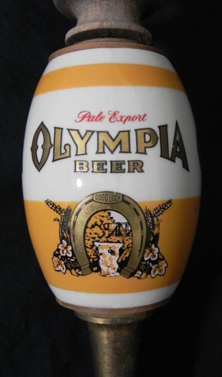 VINTAGE OLYMPIA BEER TAPPER, SPIGET AND WOOD HANDLE-O/A 15 1/2"-GLAZED CERAMIC CENTER GREAT COMPLETE CERAMIC BREWMANIA