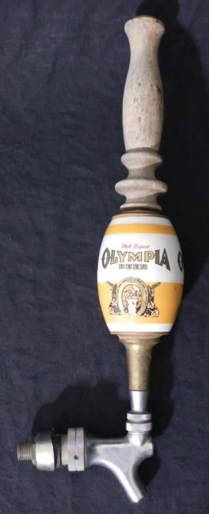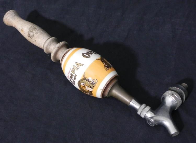 VINTAGE OLYMPIA BEER TAPPER, SPIGET AND WOOD HANDLE-O/A 15 1/2"-GLAZED CERAMIC CENTER GREAT COMPLETE CERAMIC BREWMANIA