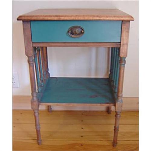 AN INTERESTING LITTLE STAND TABLE WITH NATURAL WOOD AND PAINTED SURFACE. DID SOMEONE PLAN ON THIS LOOK OR DID THEY GET TIRED OF STRIPPING IT DOWN AND JUST QUIT? ACTUALLY, THIS FINISH MAKES IT SPECIAL. IT WAS MADE WITH GOOD LINES AND SOUND CONSTRUCTION, WITH A DOVETAILED DRAWER. IT WOULD BE NICE IN MANY SETTINGS.