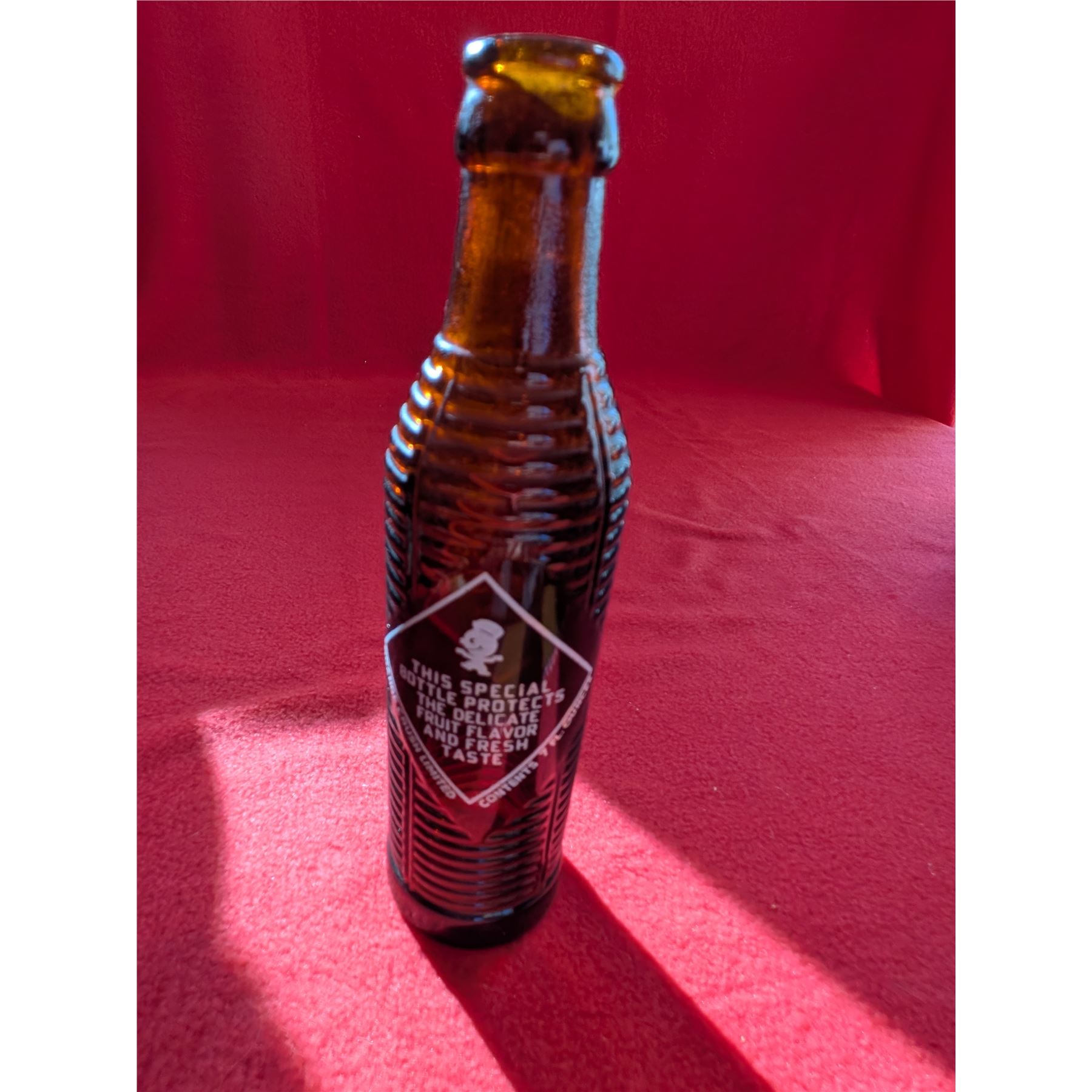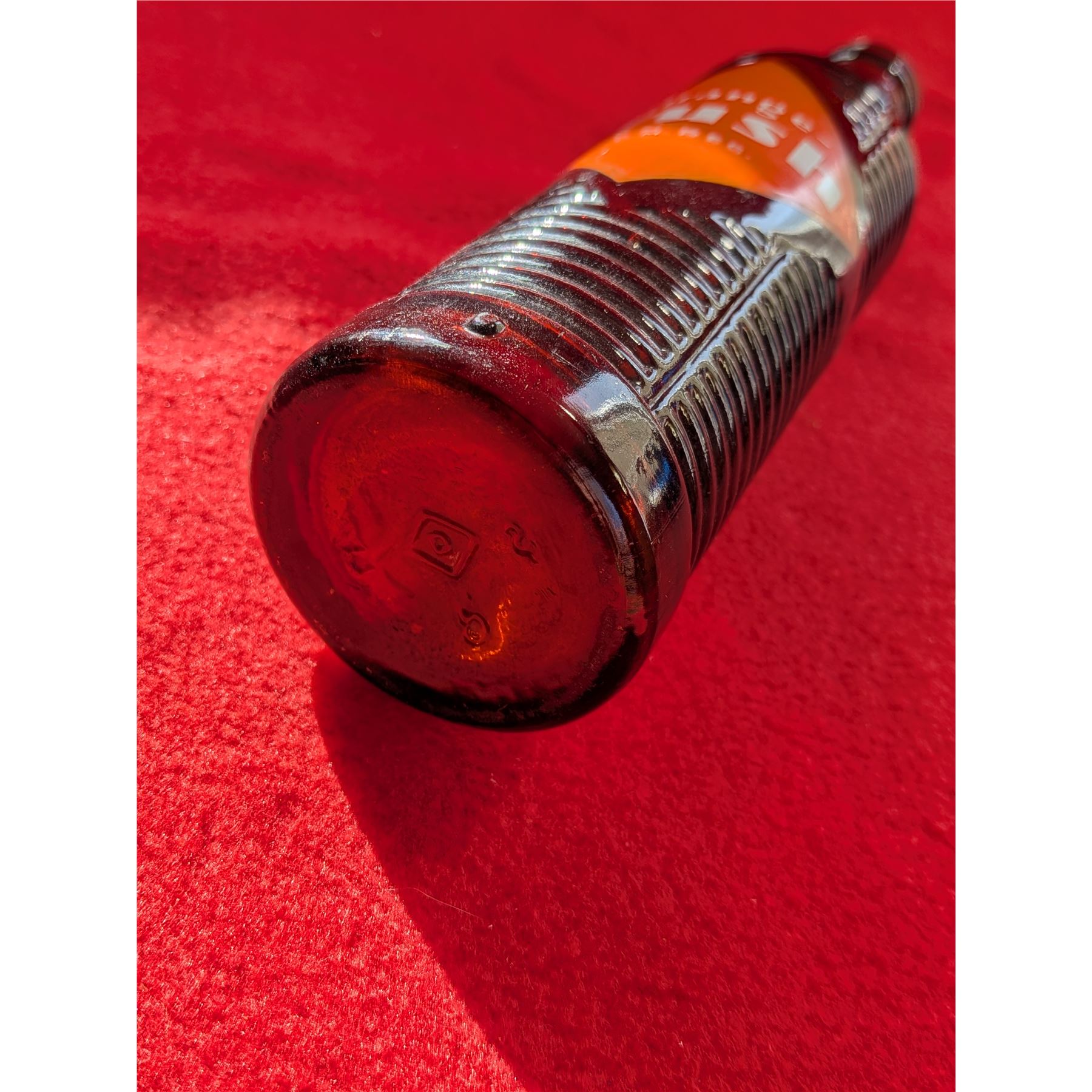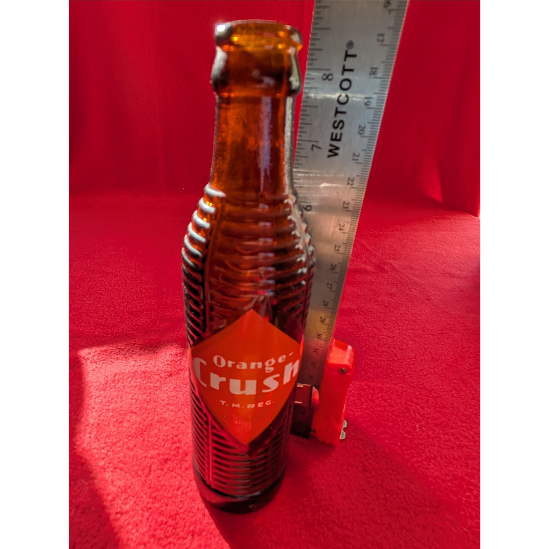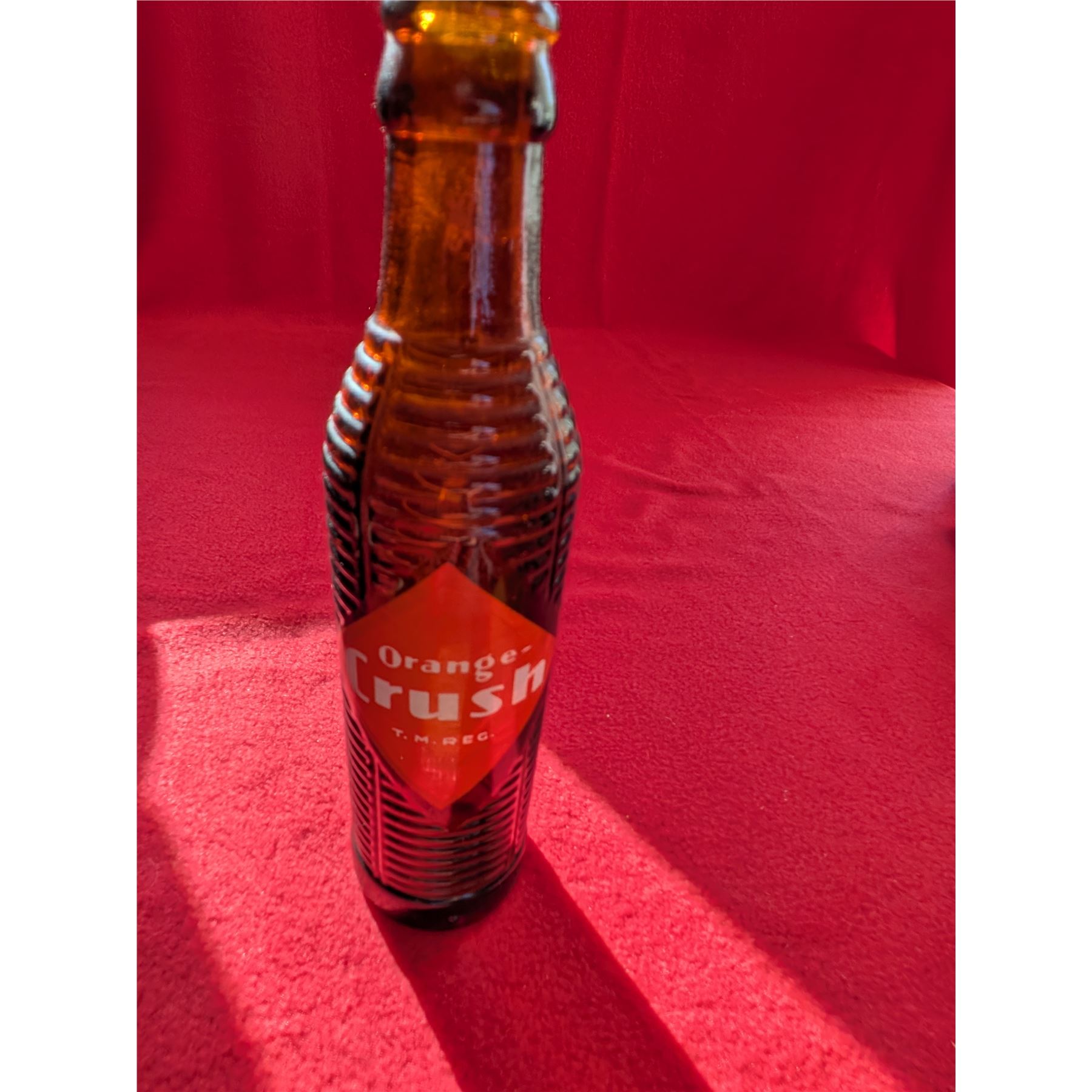 Vintage Orange Crush soda bottle, likely dating from the 1920s to the 1950s based on its amber, ribbed "krinkly" design.