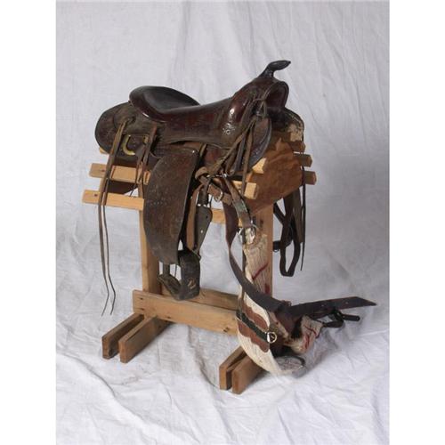 SADDLERY: Oregon Leather Company (Portland, 110 NW Second Avenue) tooled leather saddle, stirrups, brass fittings, lambswool at underside, and two cotton rope cinches; third quarter 20th c. Wear commensurate with use and age. 15.25'' from swells to back of seat.