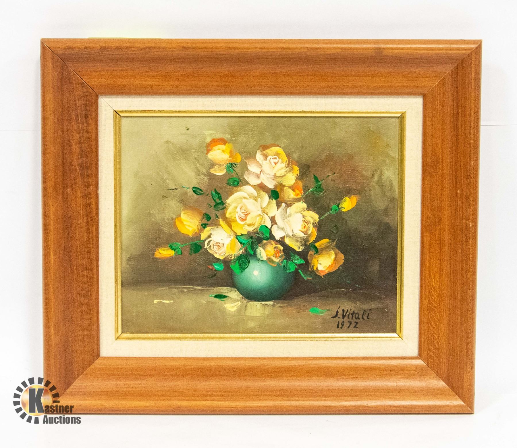 SIGNED VITALI ORIGINAL ART, STILL LIFE FLORAL, SIGNED FRONT AND BACK, VINTAGE MID CENTURY SOLID WOOD FRAME **ALL ITEMS MUST BE REMOVED BY 5PM SATURDAY, APRIL 15TH 2023. ALL REMAINING ITEMS WILL BE SUBJECT TO A $6.00 PER DAY STORAGE CHARGE. ANY ITEMS REMAINING AFTER MONDAY, APRIL 30TH, 2023 WILL BE CONSIDERED FORFEITED. NO REFUNDS WILL BE ISSUED FOR FORFEITED ITEMS. TO SCHEDULE A PICK UP APPOINTMENT CLICK HERE