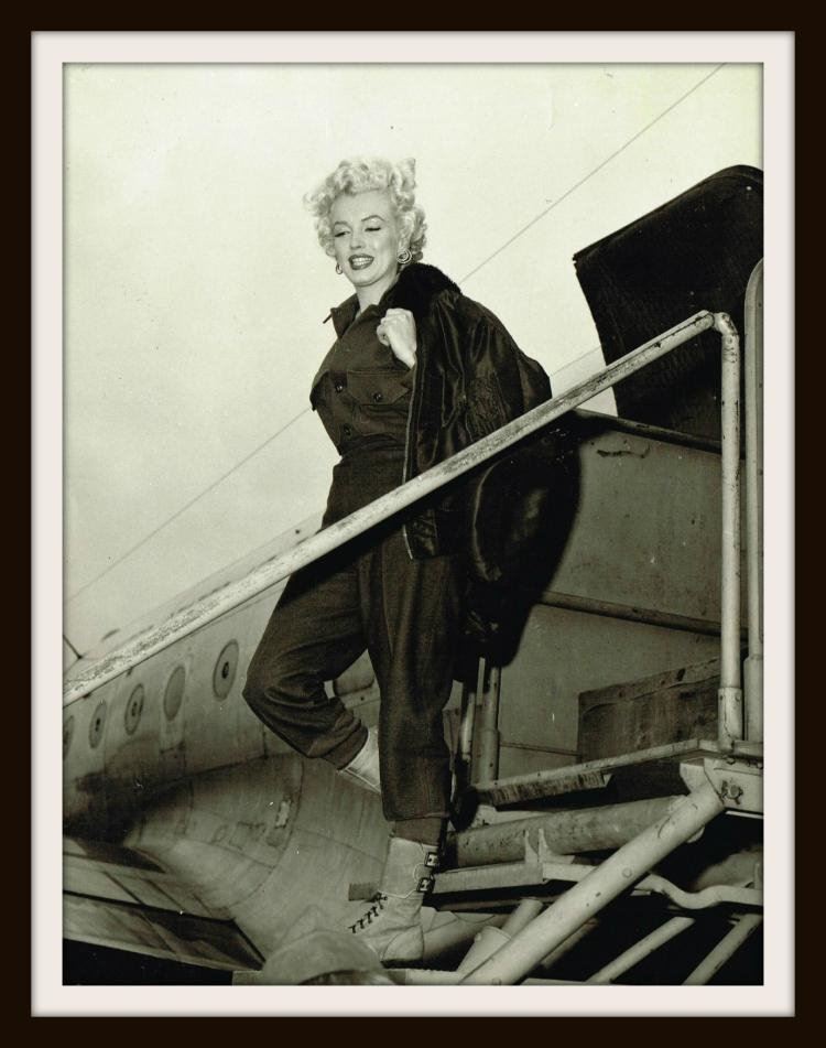 A vintage photo from 1954 of Marilyn Monroe arriving in Korea. Marilyn took a break from her honeymoon to Joe Dimaggio to entertain US troops. 10x8 inches, professionally mounted and framed in black wood.