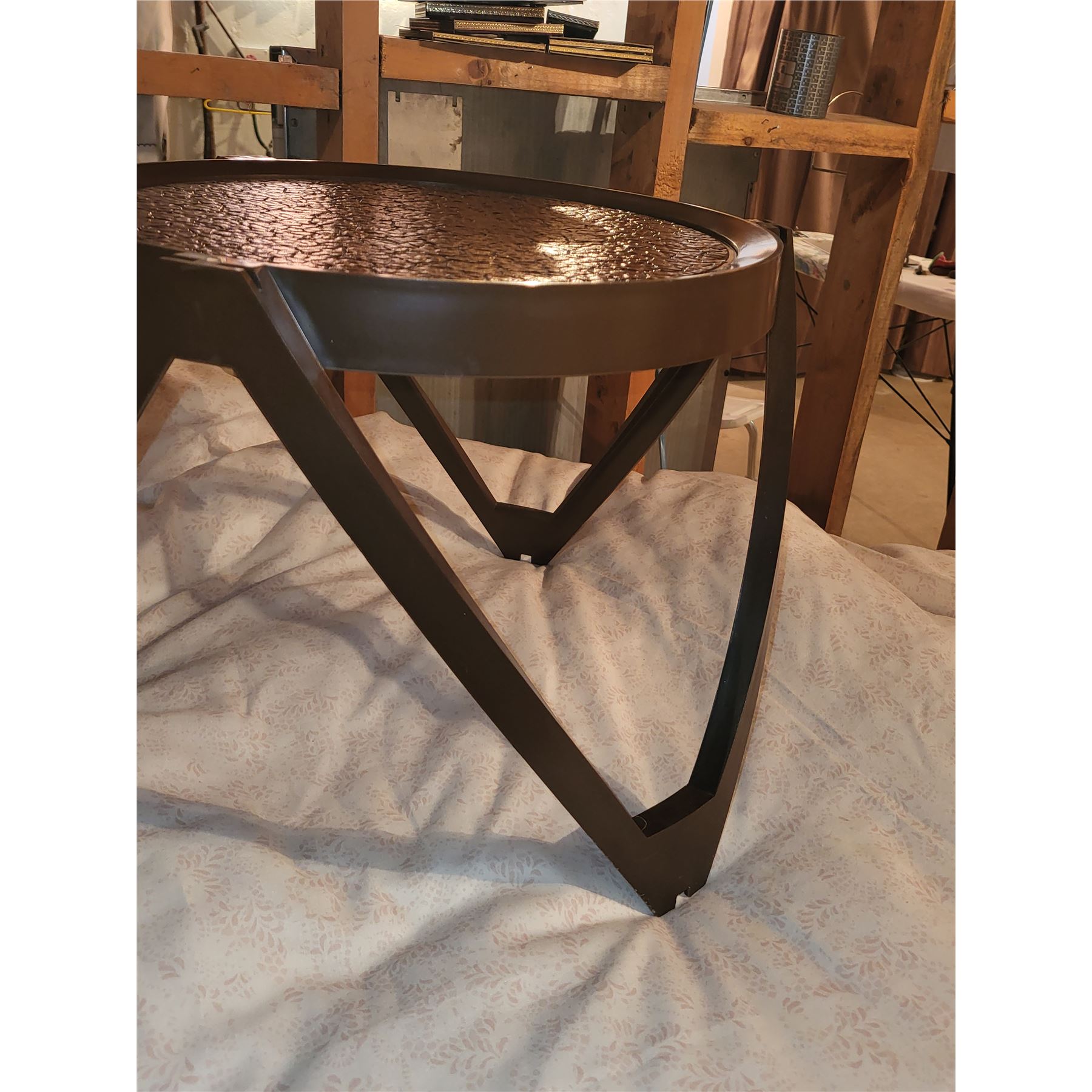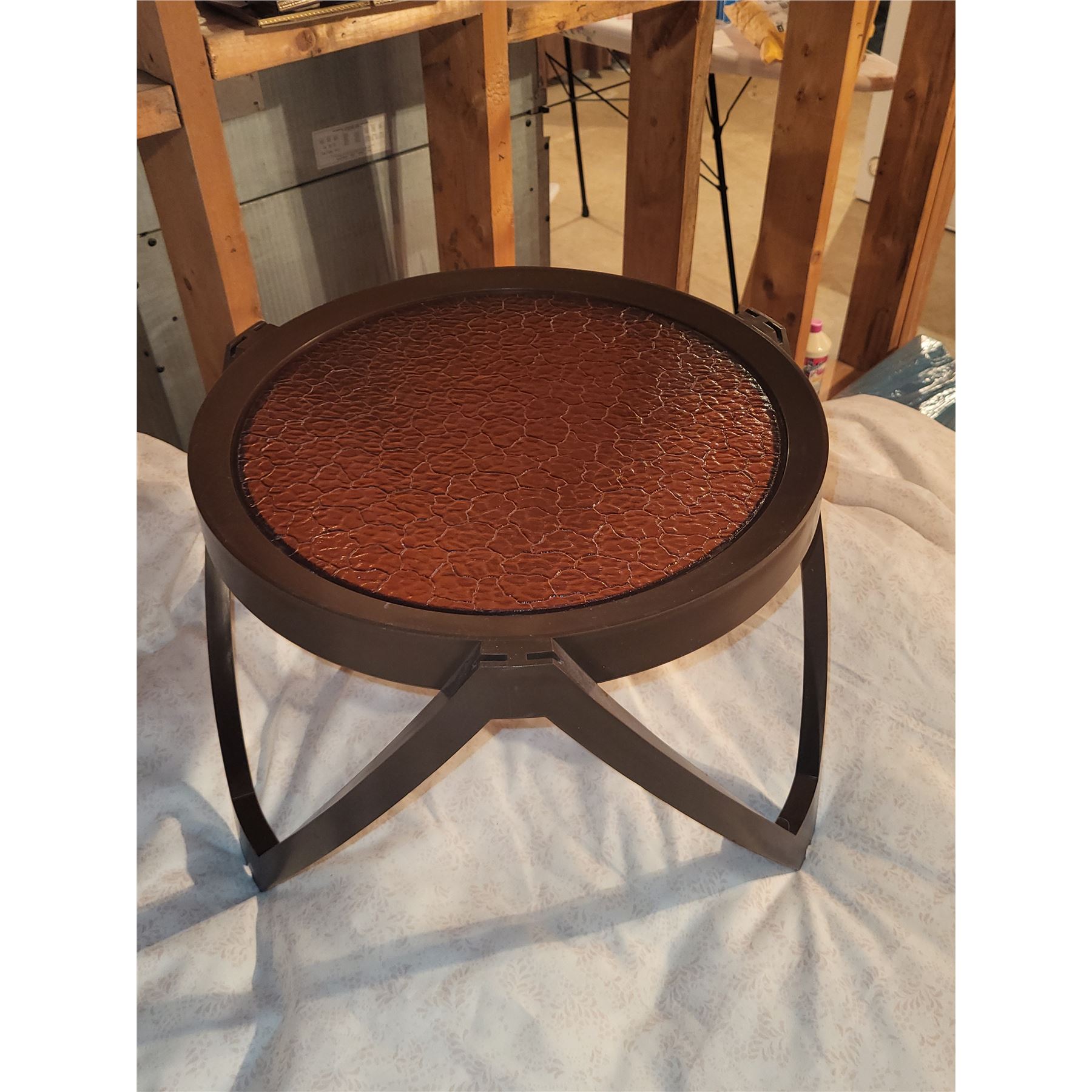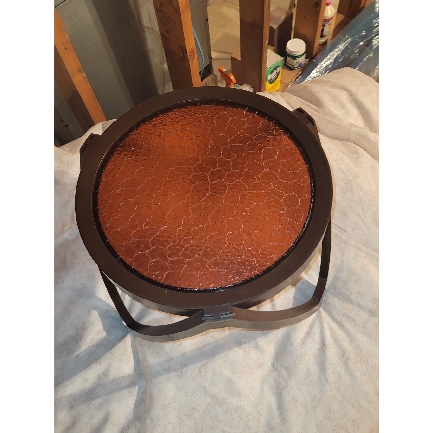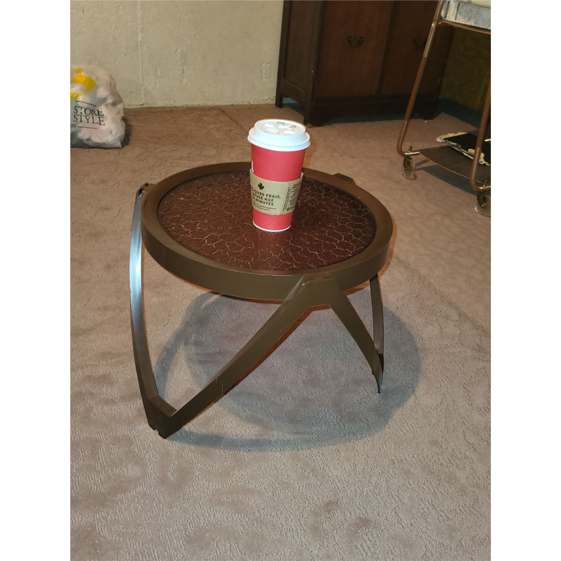 VINTGE OUTDOOR SIDE PATIO TABLE. PLASTIC. GOOD CONDITION. MEASEURES 17.5" X 14"
