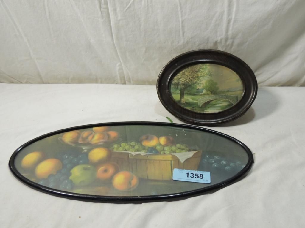 BRIDGE PRINT BEAUTIFUL WOODEN FRAME. METAL OVAL FRAME WITH PRINT OF STILL LIFE FRUIT BOWL. AS SHOWN SEE PHOTO FOR MORE DETAILS.