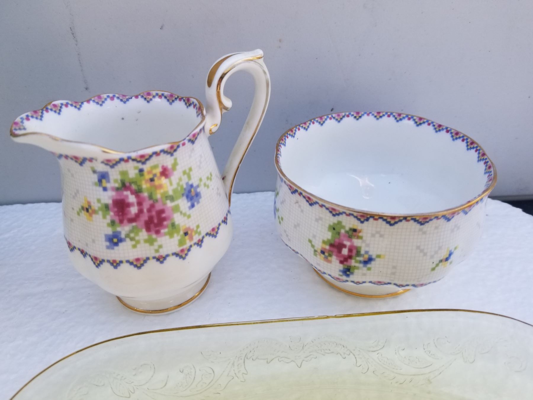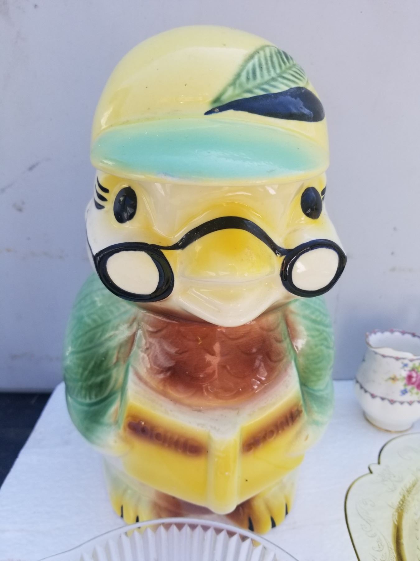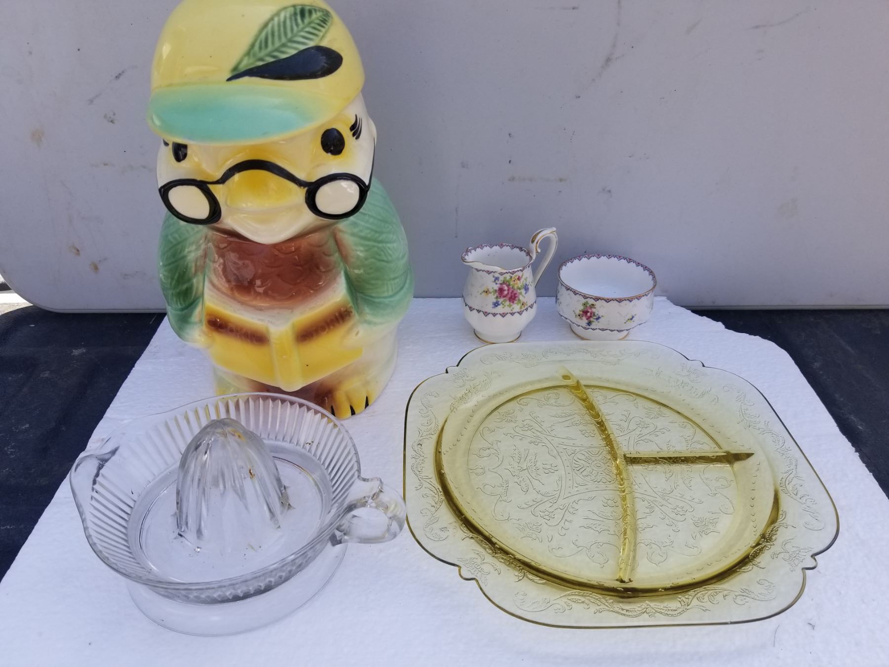 VINTAGE OWL COOKIE JAR, JUICER, DEPRESSION PICKLE PLATE, PETIT POINT CREAM AND SUGAR