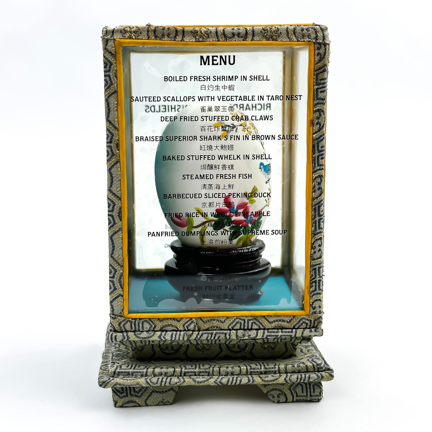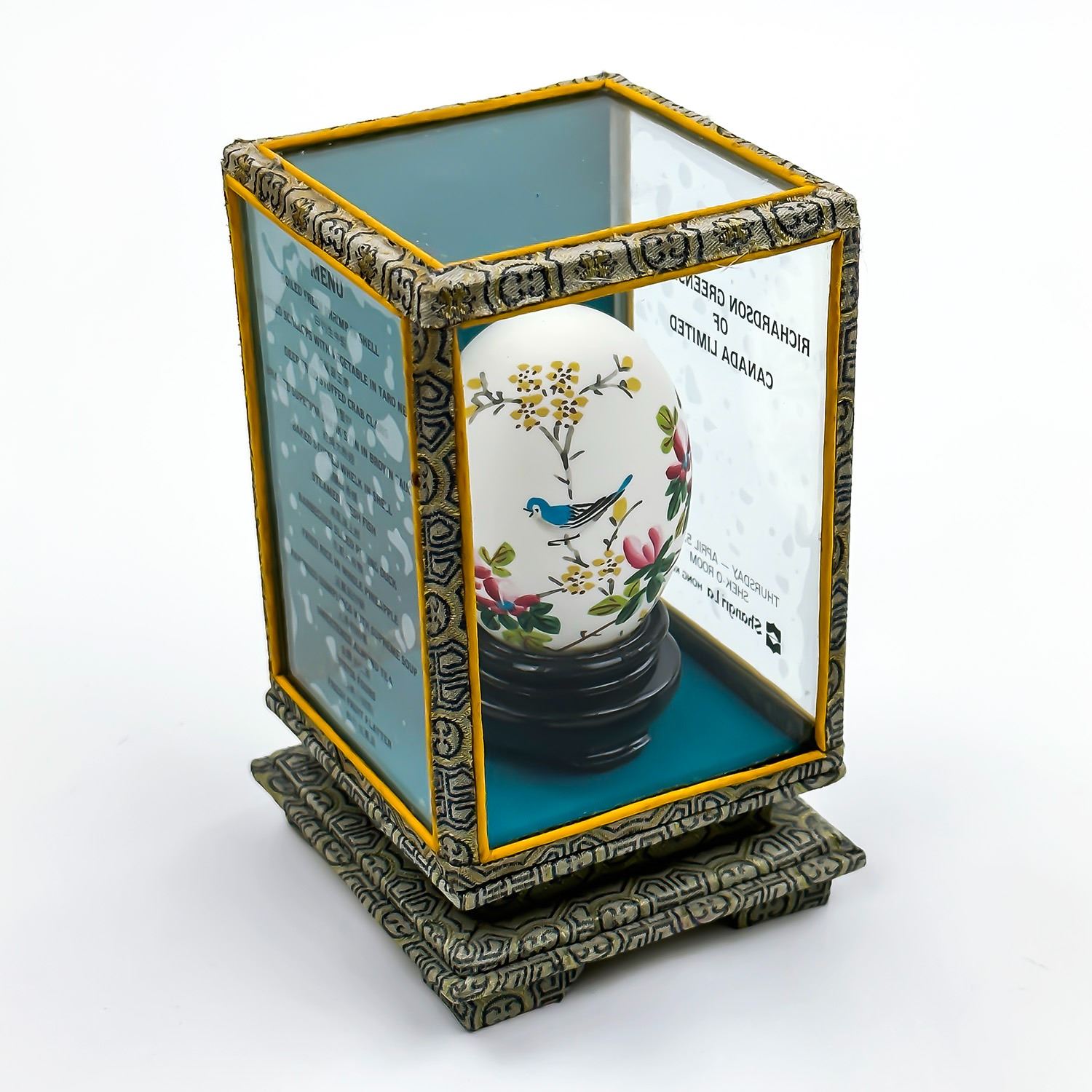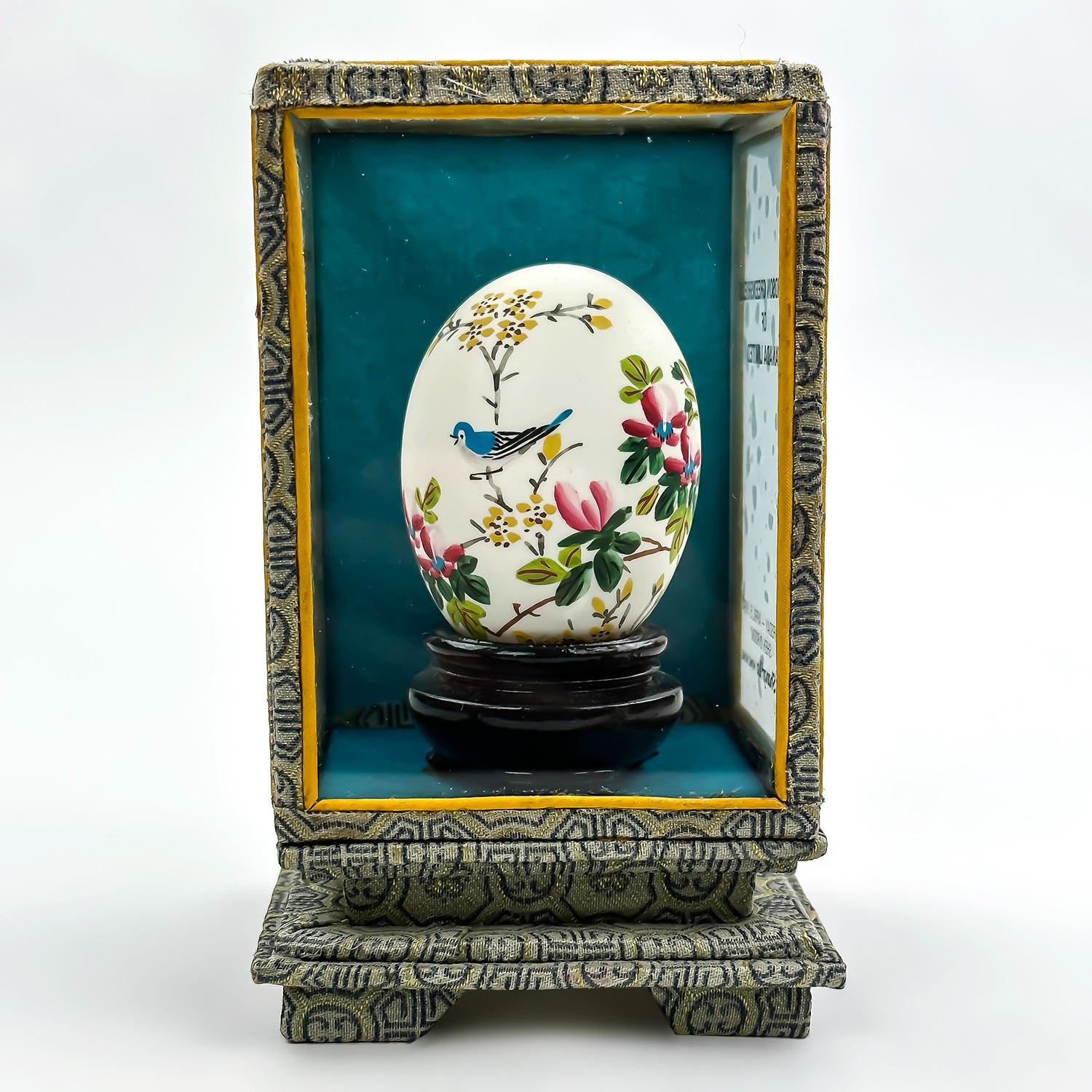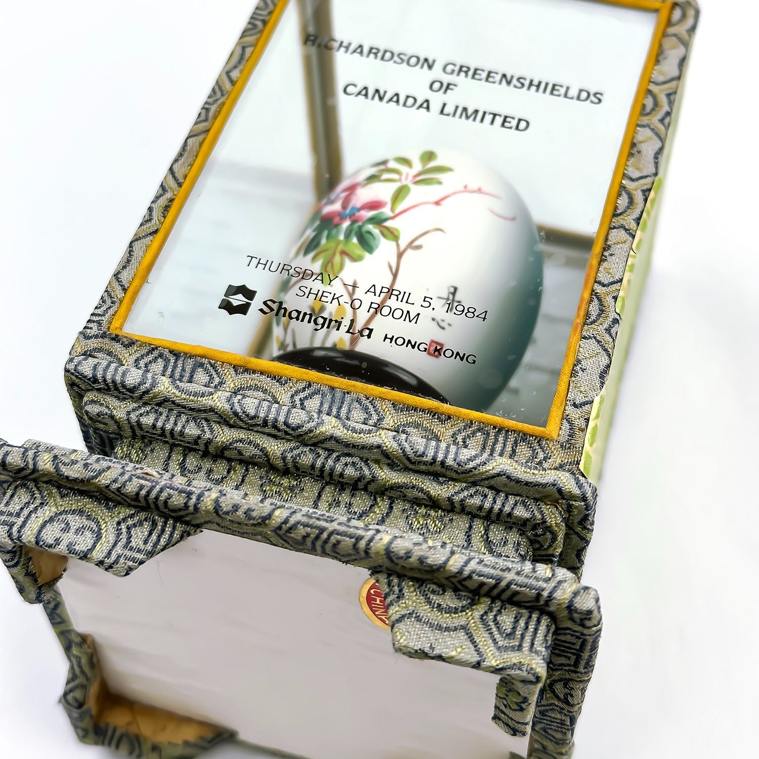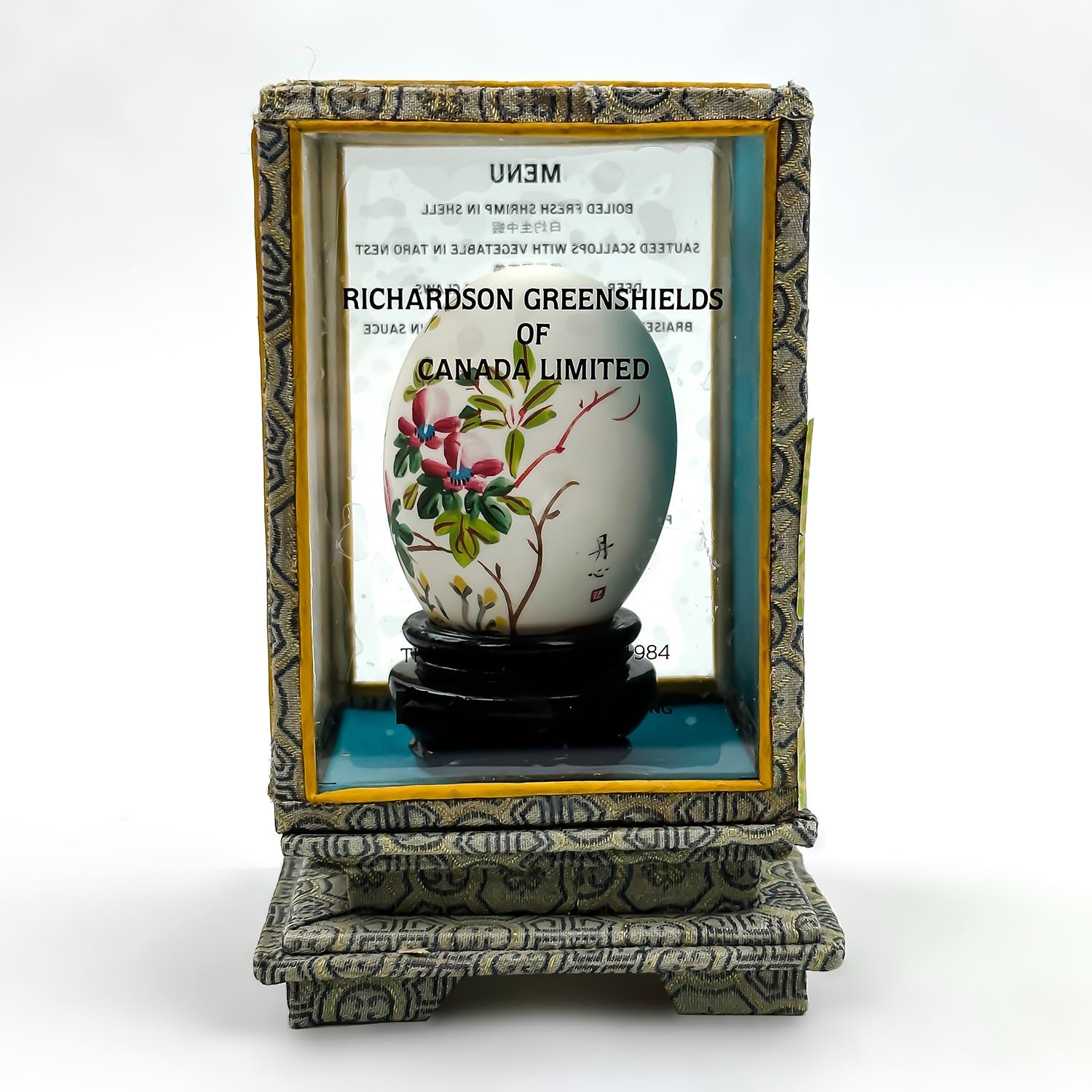 #8097 - ORIENTAL HAND PAINTED & SIGNED EGG - FLORAL AND BIRD THEME. IT WAS ALSO USED AS ADVERTISING FOR: RICHARD GREENSHIELDS OF CANADA LIMITED - THURSDAY - APRIL 5, 1984 - SHEK-O ROOM, SHANGRI-LA HONG KONG. APPEARS TO BE FROM AN EVENTFOR RICHARDSON***ITEM(S) LOCATED IN LETHBRIDGE ALBERTA. FREE TRANSPORT TO EDMONTON OFFICE AVAILABLE FOR THIS AUCTION. WORLDWIDE SHIPPING IS AVAILABLE FOR ALL ITEMS