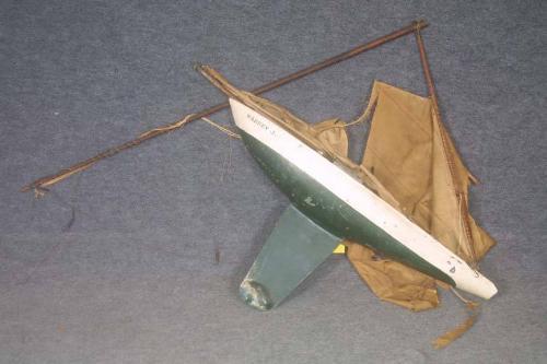 VINTAGE PAINTED METAL POND BOAT with original sail length: 43"