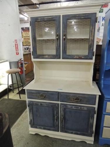 VINTAGE PAINTED PINE WOOD PLATE & LINEN CABINET: 2 GLASS DOORS, 2 SECTIONS, 41X18X72. AS SHOWN. VIEW PICTURE FOR DETAIL.