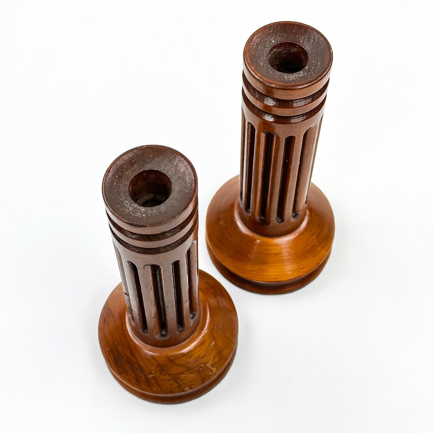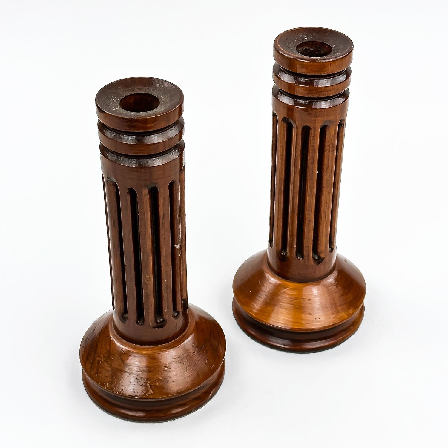 #8102 - UNMARKED HAND CRAFTED FLUTED WOOD CANDLE HOLDERS. THEY MEASURE: 7.5” (19 CM) TALL BY 3.5” (9 CM) DIAMETER BASE AND 1.75” (4.5 CM) DIAMETER COLUMN
